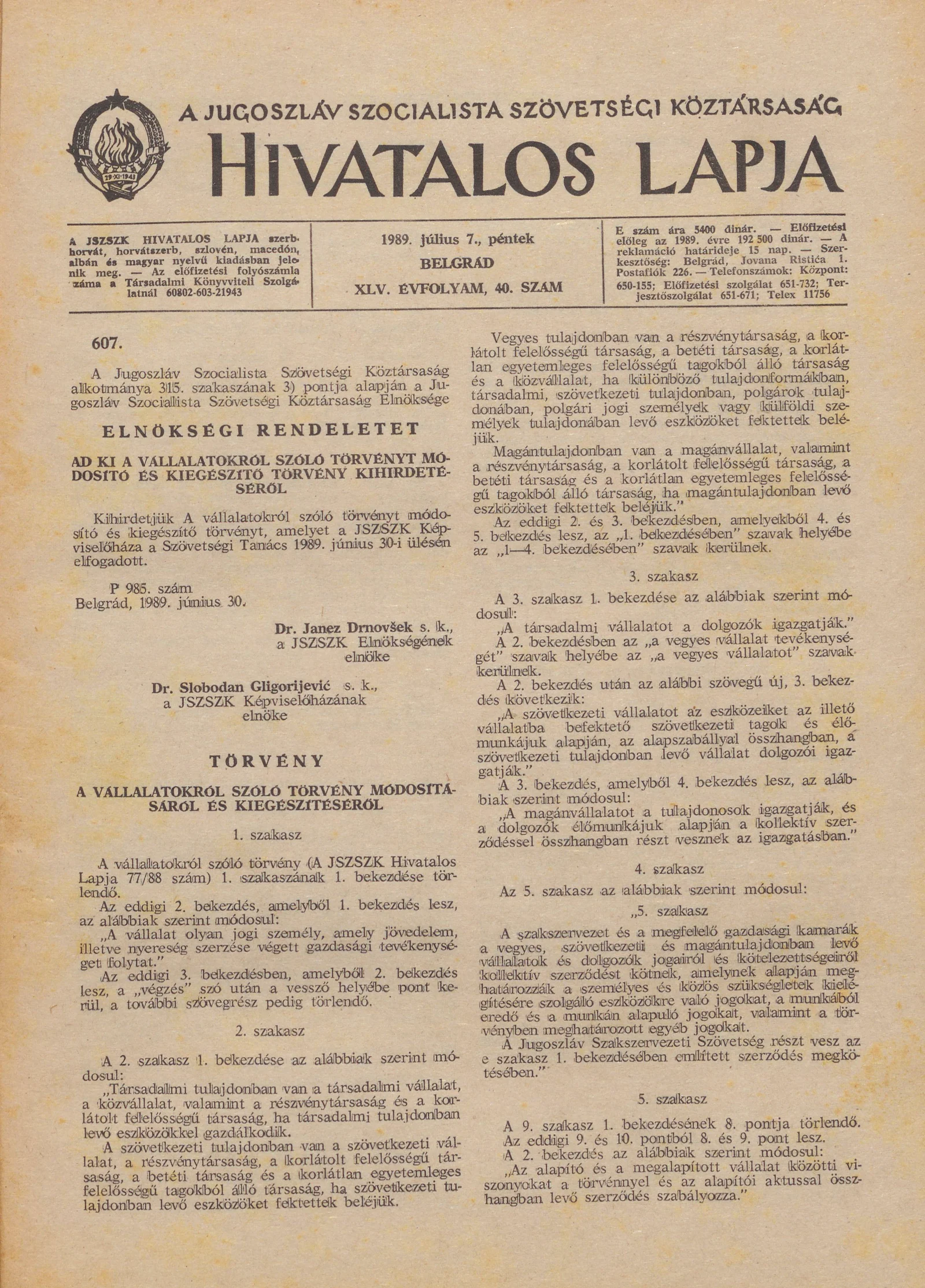A Jugoszláv Szocialista Szövetségi Köztársaság Hivatalos Lapja, 45. évf. 1989. július 7. 40. sz. 1033–1060. oldal