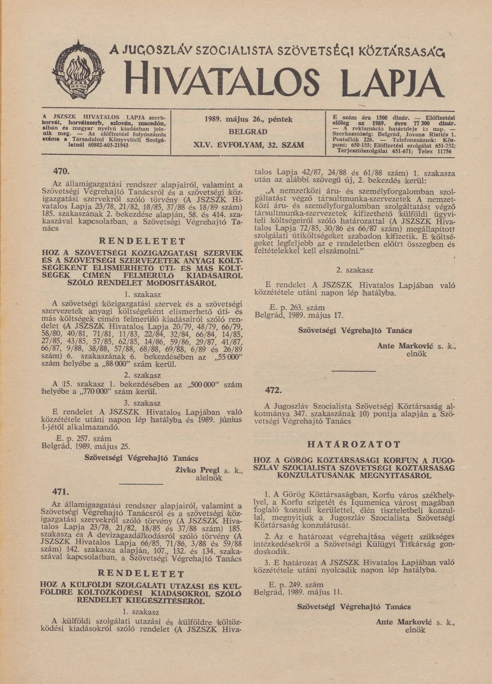 A Jugoszláv Szocialista Szövetségi Köztársaság Hivatalos Lapja, 45. évf. 1989. május 26. 32. sz. 805–820. oldal