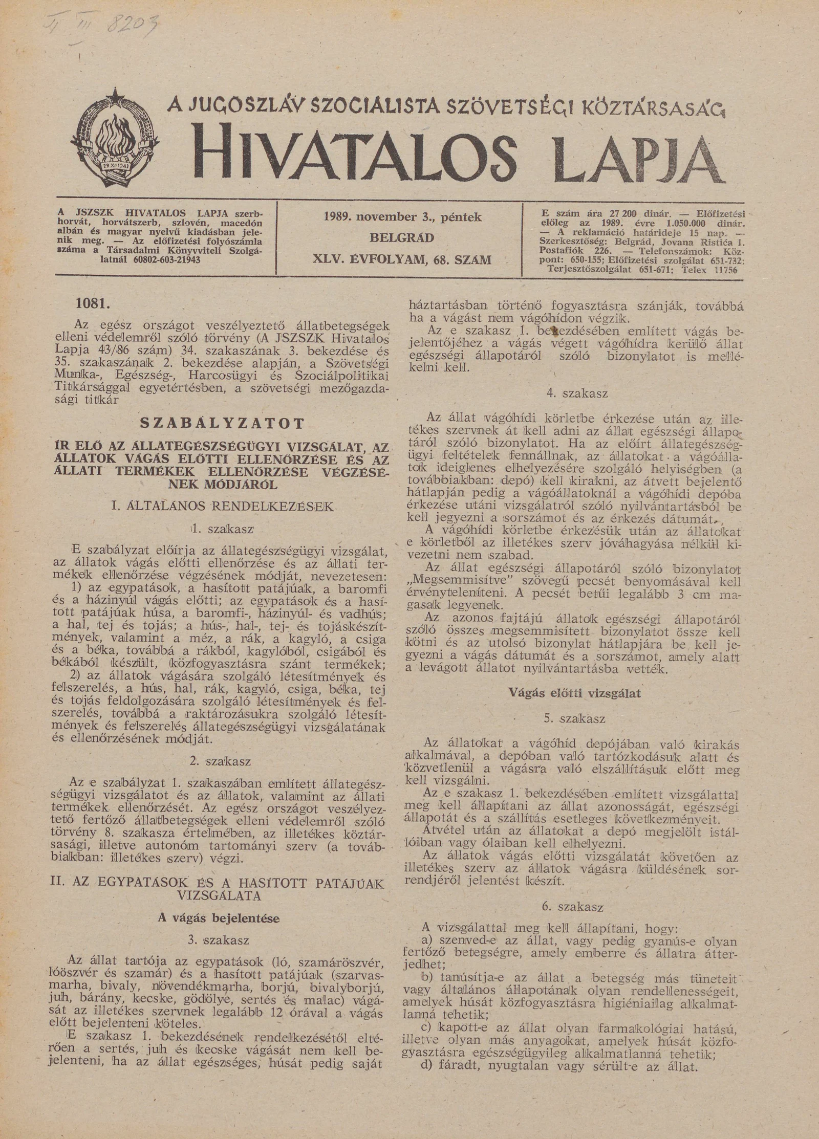 A Jugoszláv Szocialista Szövetségi Köztársaság Hivatalos Lapja, 45. évf. 1989. november 3. 68. sz. 1685–1720. oldal