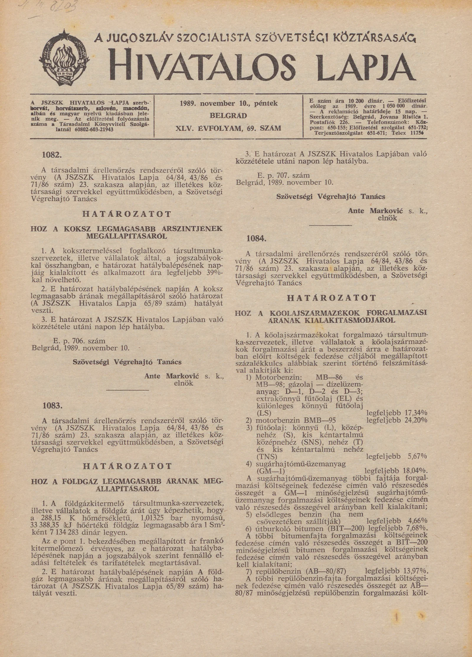 A Jugoszláv Szocialista Szövetségi Köztársaság Hivatalos Lapja, 45. évf. 1989. november 10. 69. sz. 1721–1728. oldal
