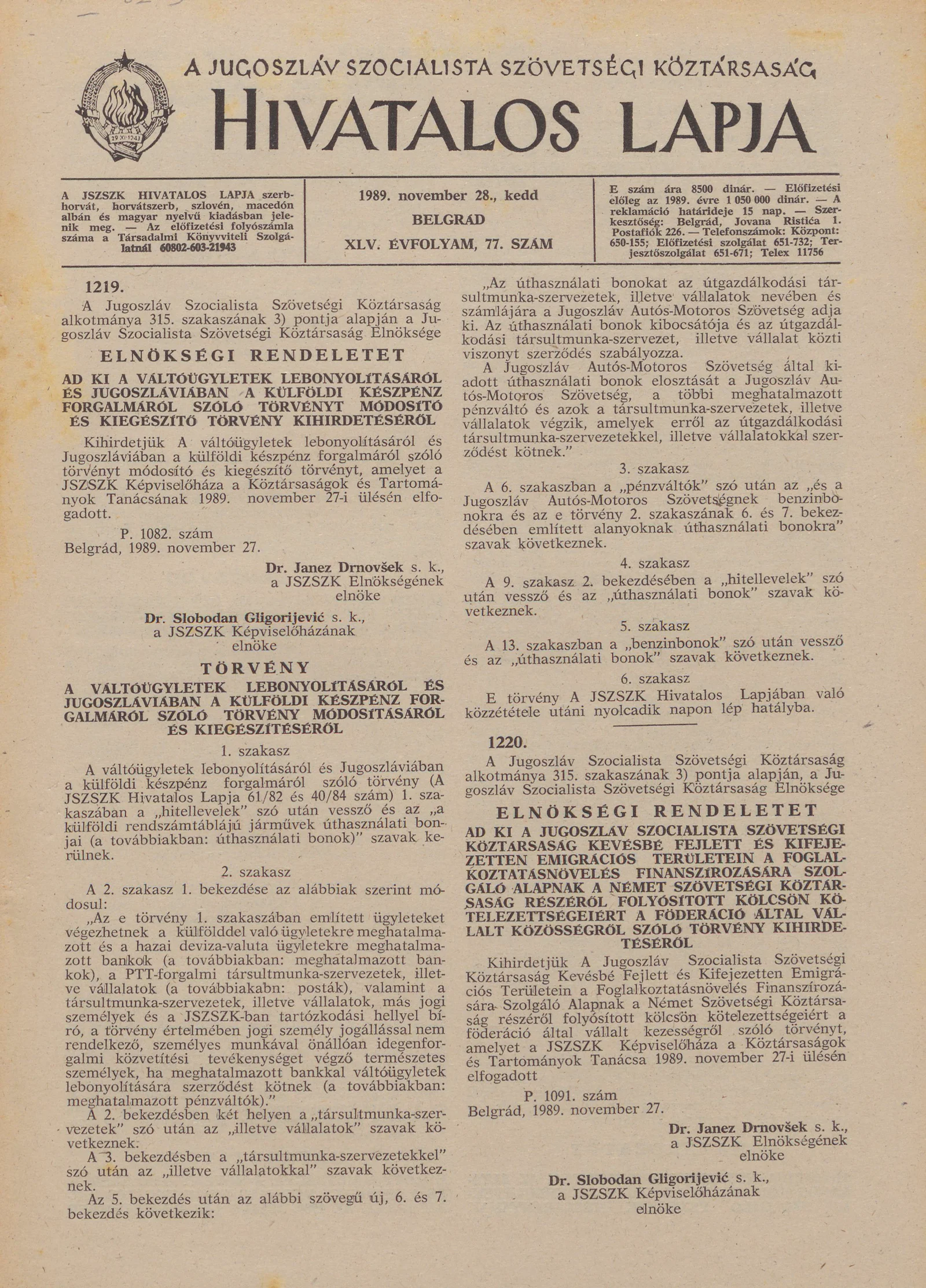 - A Jugoszláv Szocialista Szövetségi Köztársaság Hivatalos Lapja