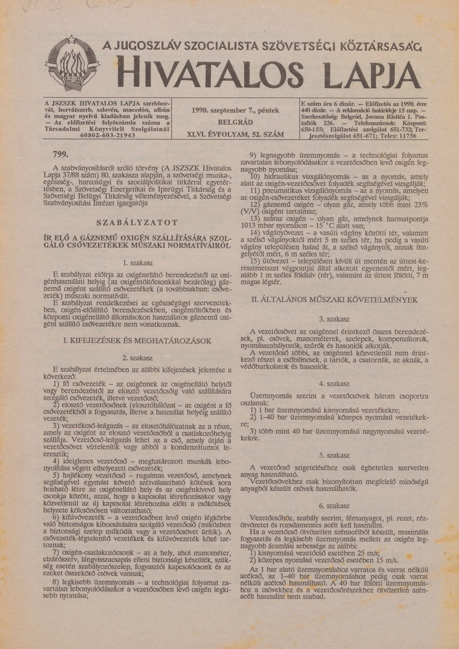 A Jugoszláv Szocialista Szövetségi Köztársaság Hivatalos Lapja, 46. évf. 1990. szeptember 7. 52. sz. 1721–1744. oldal