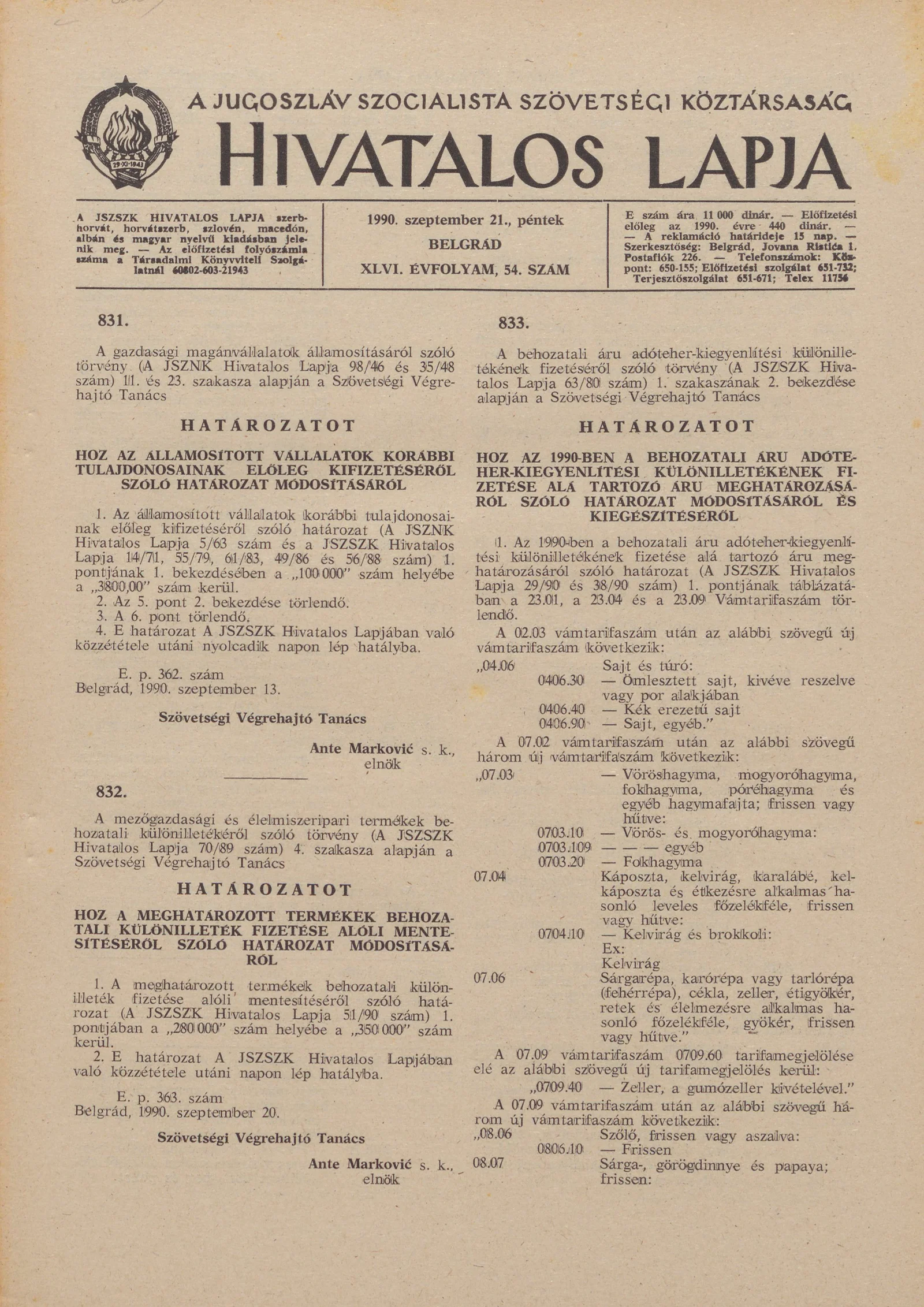 A Jugoszláv Szocialista Szövetségi Köztársaság Hivatalos Lapja, 46. évf. 1990. szeptember 21. 54. sz. 1753–1776. oldal
