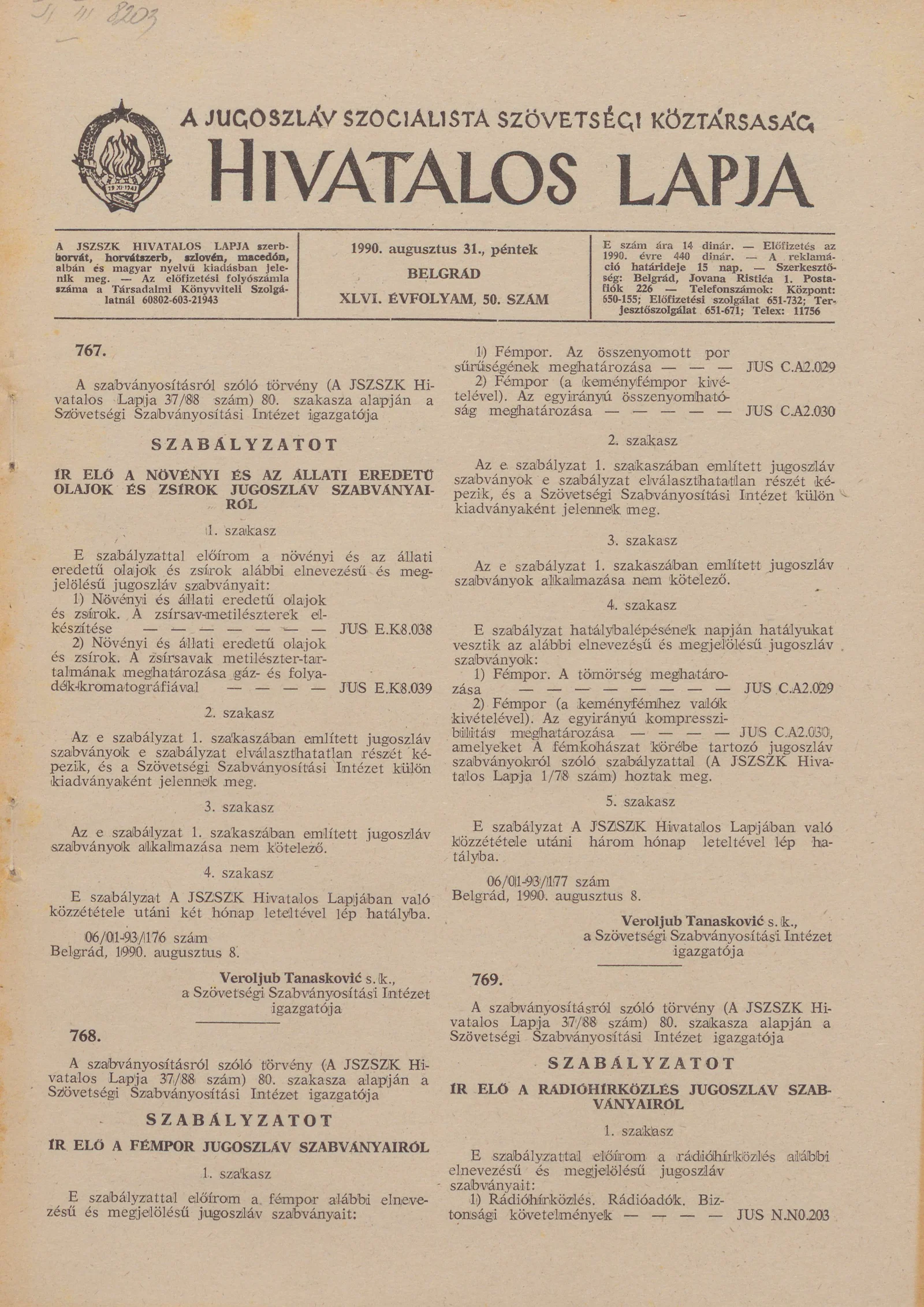 A Jugoszláv Szocialista Szövetségi Köztársaság Hivatalos Lapja, 46. évf. 1990. augusztus 31. 50. sz. 1629–1716. oldal