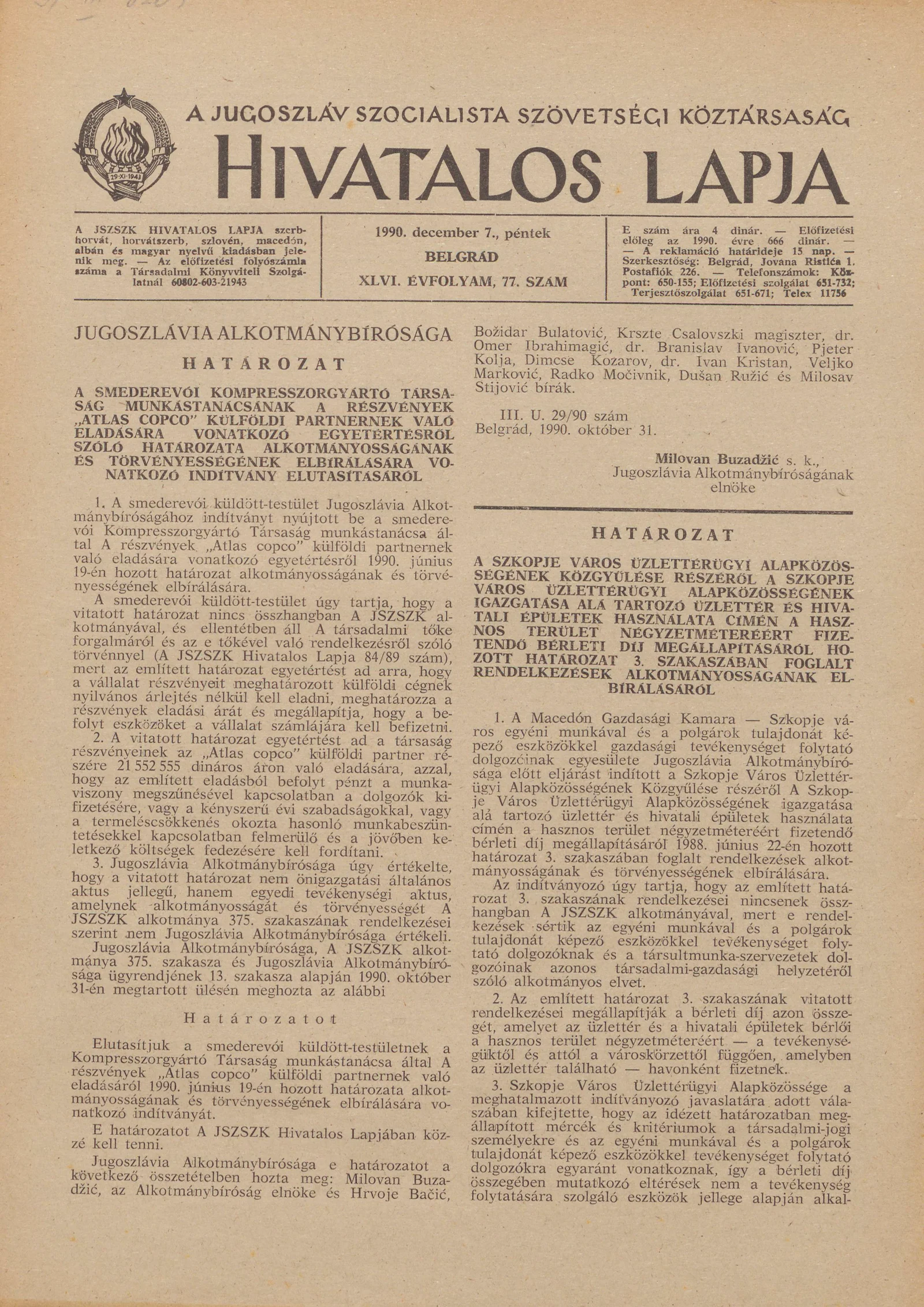A Jugoszláv Szocialista Szövetségi Köztársaság Hivatalos Lapja, 46. évf. 1990. december 7. 77. sz. 2229–2232. oldal