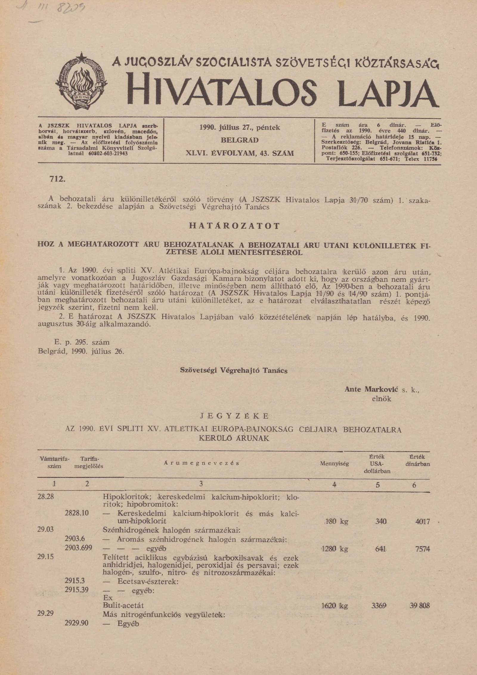A Jugoszláv Szocialista Szövetségi Köztársaság Hivatalos Lapja, 46. évf. 1990. július 27. 43. sz. 1285–1304. oldal