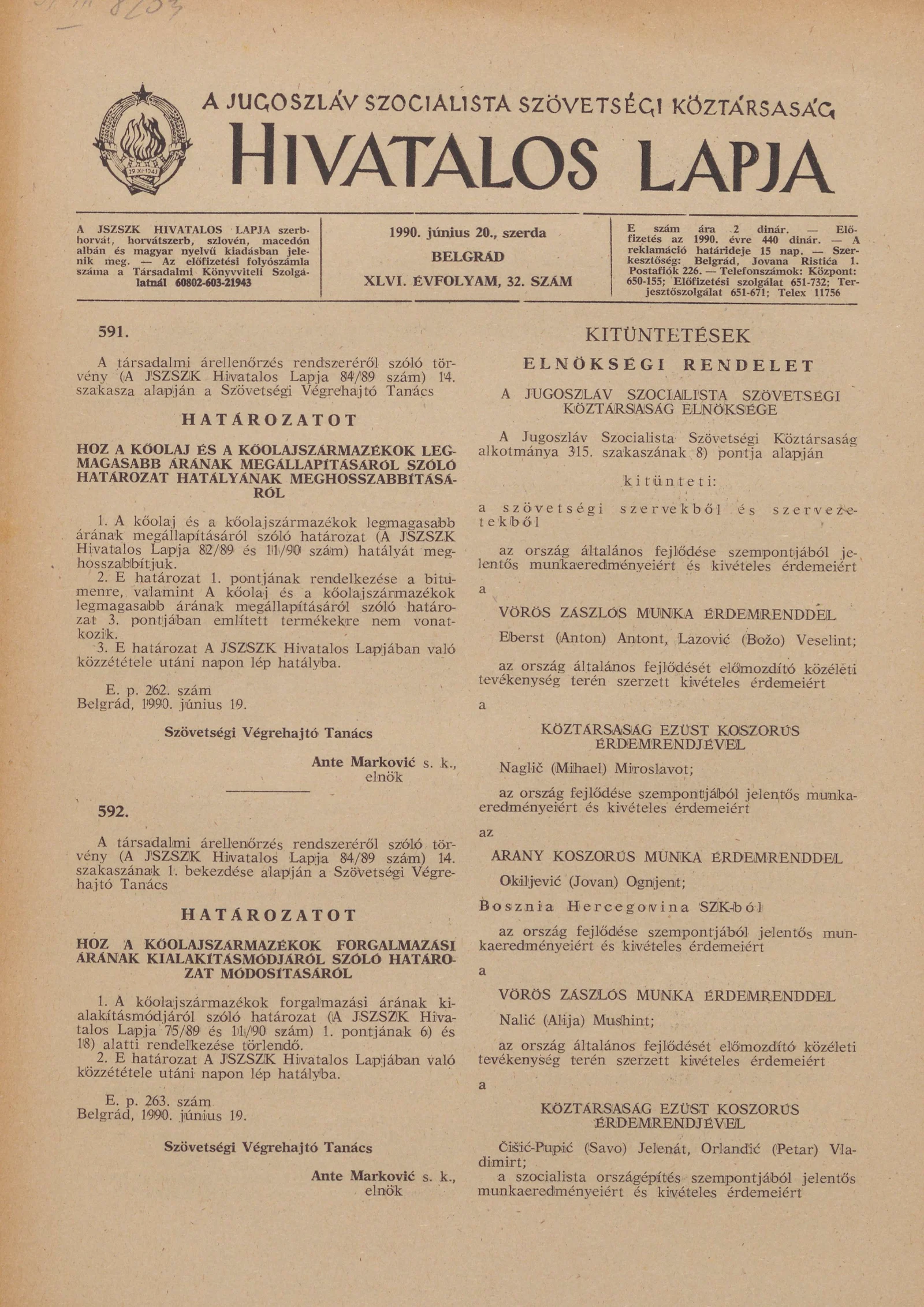 A Jugoszláv Szocialista Szövetségi Köztársaság Hivatalos Lapja, 46. évf. 1990. június 20. 32. sz. 1097–1100. oldal