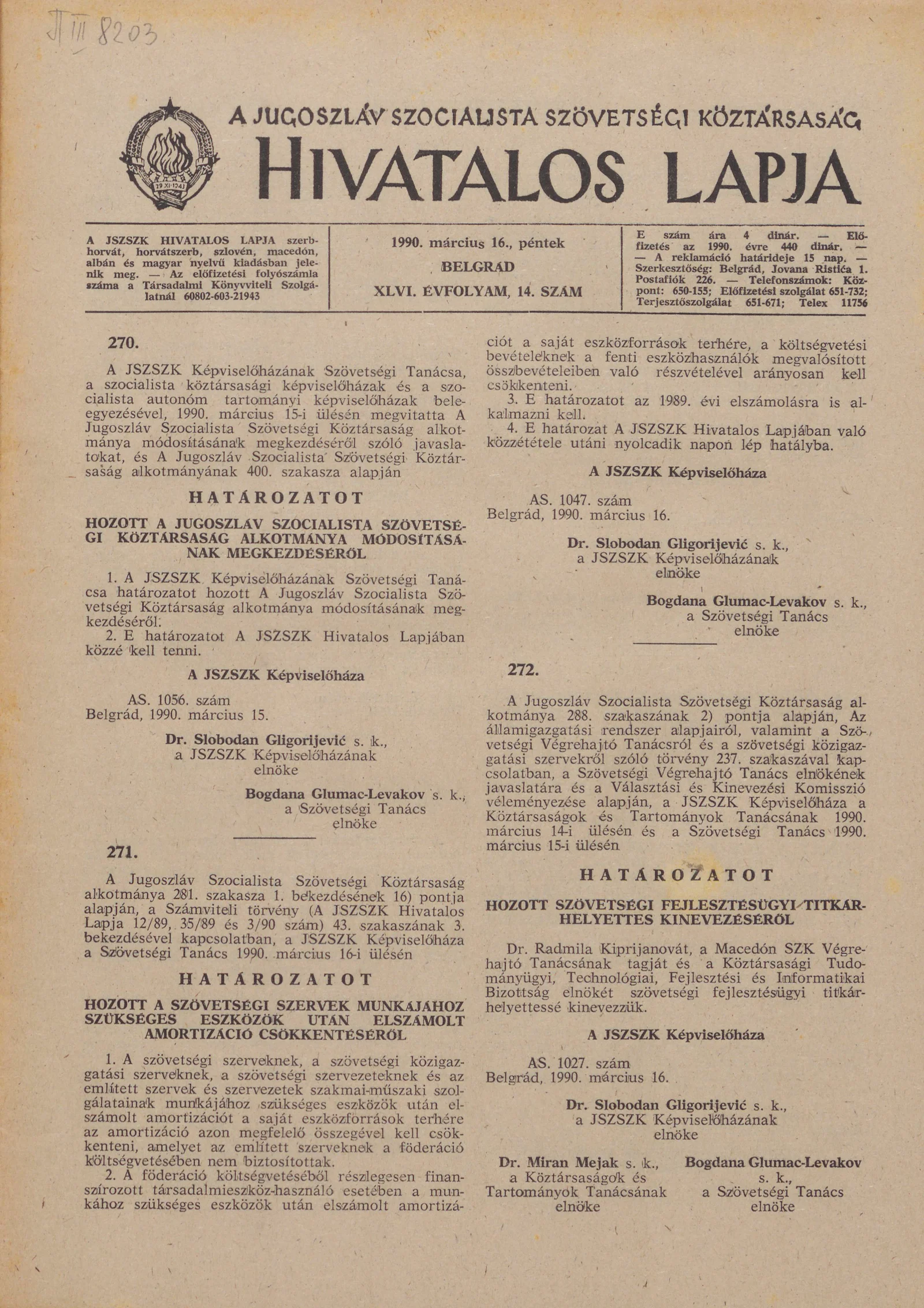 A Jugoszláv Szocialista Szövetségi Köztársaság Hivatalos Lapja, 46. évf. 1990. március 16. 14. sz. 633–652. oldal