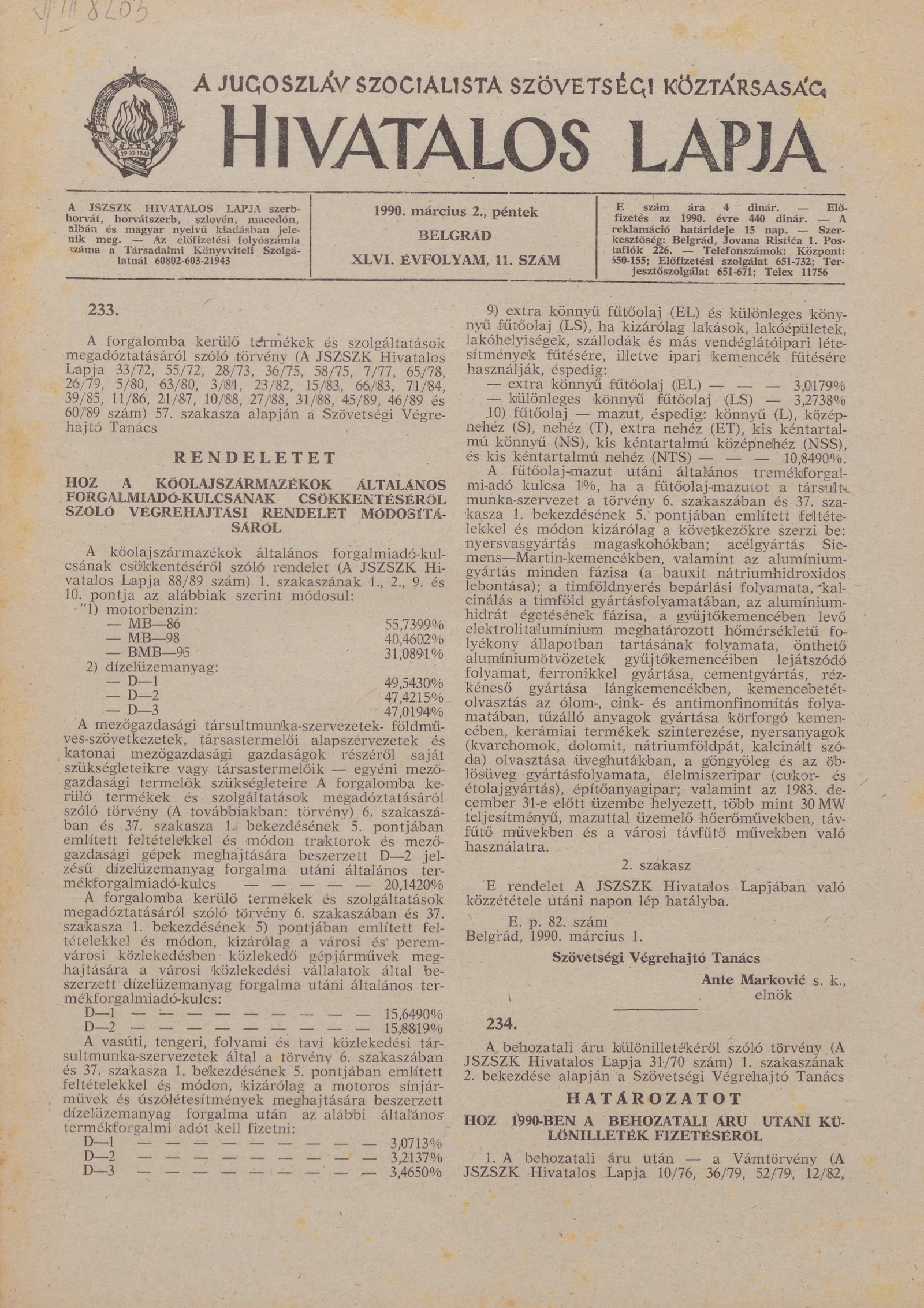 A Jugoszláv Szocialista Szövetségi Köztársaság Hivatalos Lapja, 46. évf. 1990. március 2. 11. sz. 605–620. oldal