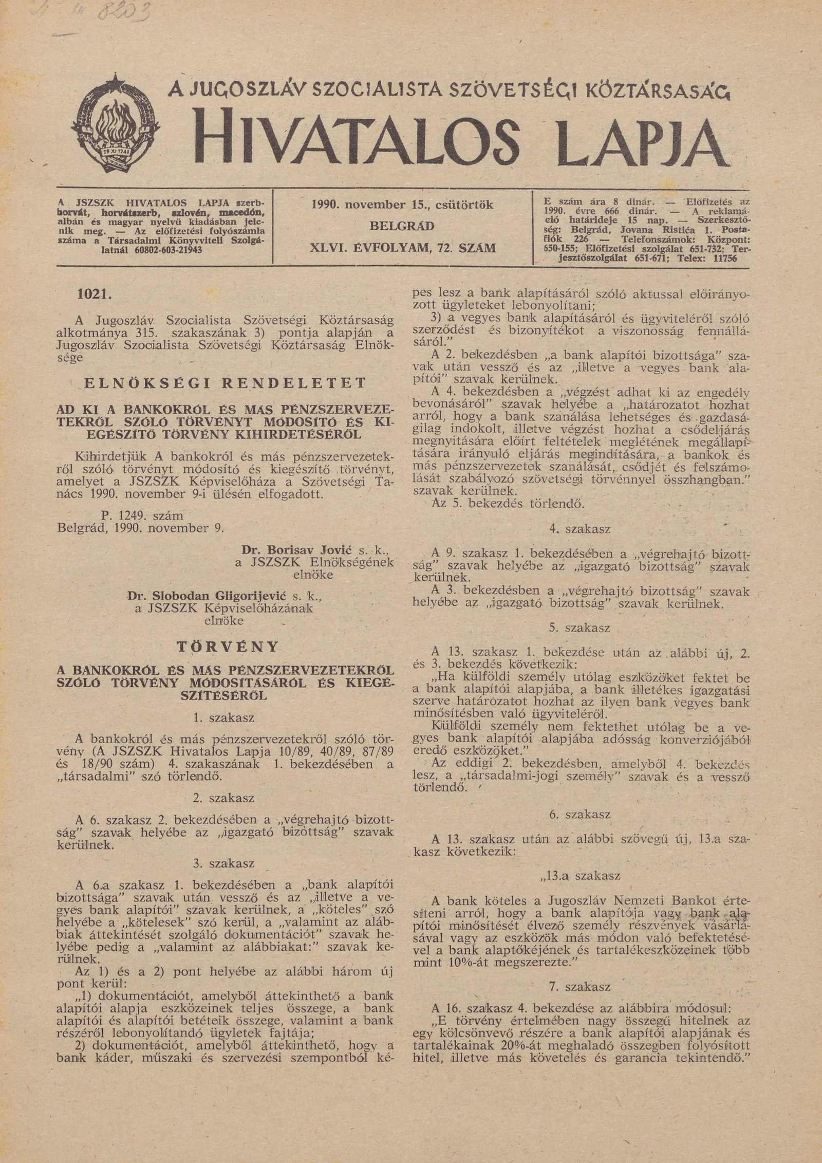 A Jugoszláv Szocialista Szövetségi Köztársaság Hivatalos Lapja, 46. évf. 1990. november 15. 72. sz. 2125–2144. oldal