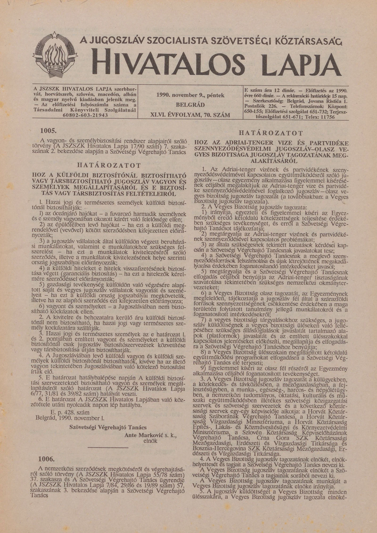A Jugoszláv Szocialista Szövetségi Köztársaság Hivatalos Lapja, 46. évf. 1990. november 9. 70. sz. 2093–2120. oldal