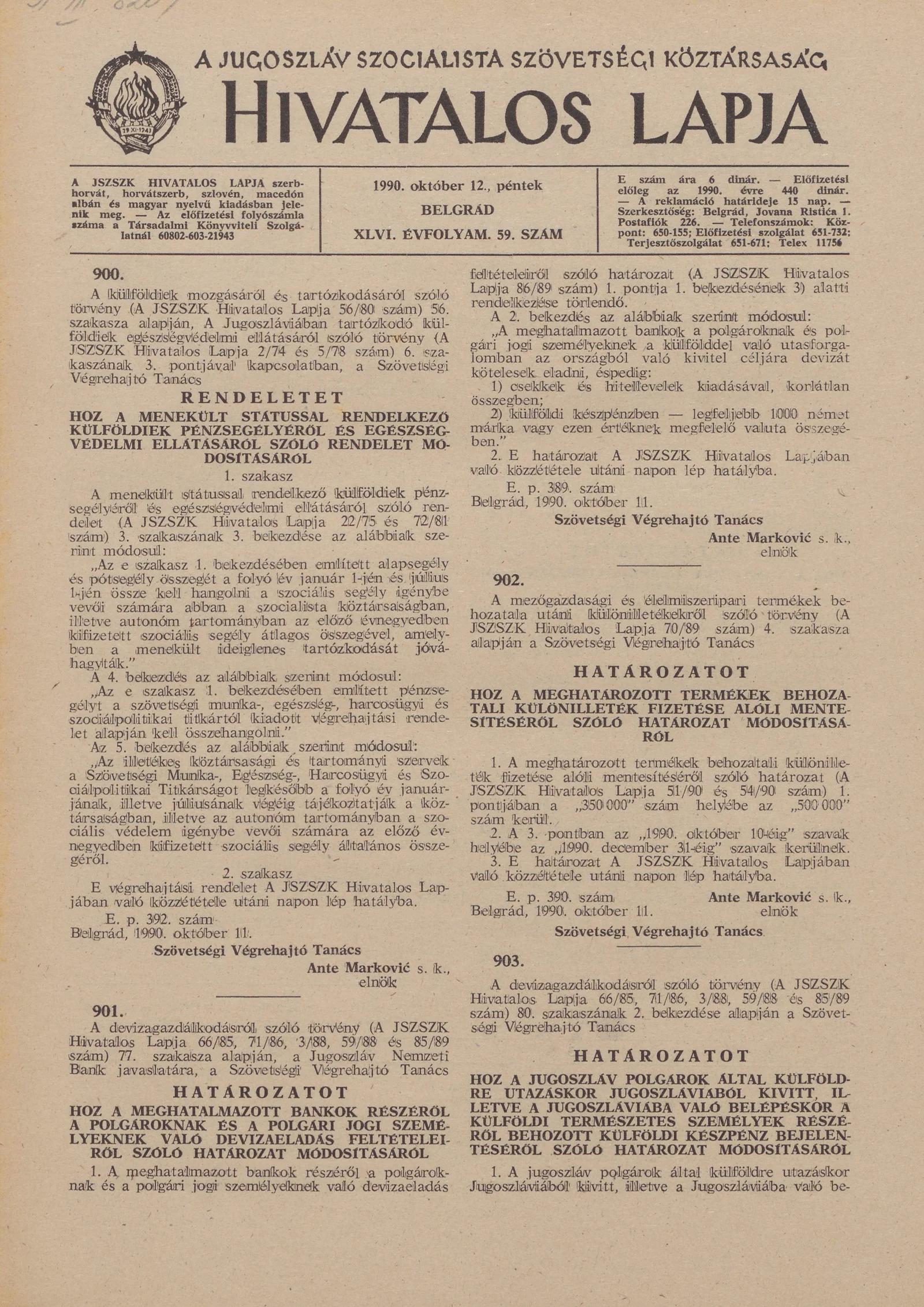 - Határozat A külföldi készpénz, csekkek és hitellevelek felvásárlásával és a benzinbonok eladásával megvalósított devizáknak a Jugoszláv Nemzeti Bank számláira való előlegezése, megküldése, letétbe helyezése és átutalása módjáról és határidőiről szóló...1844