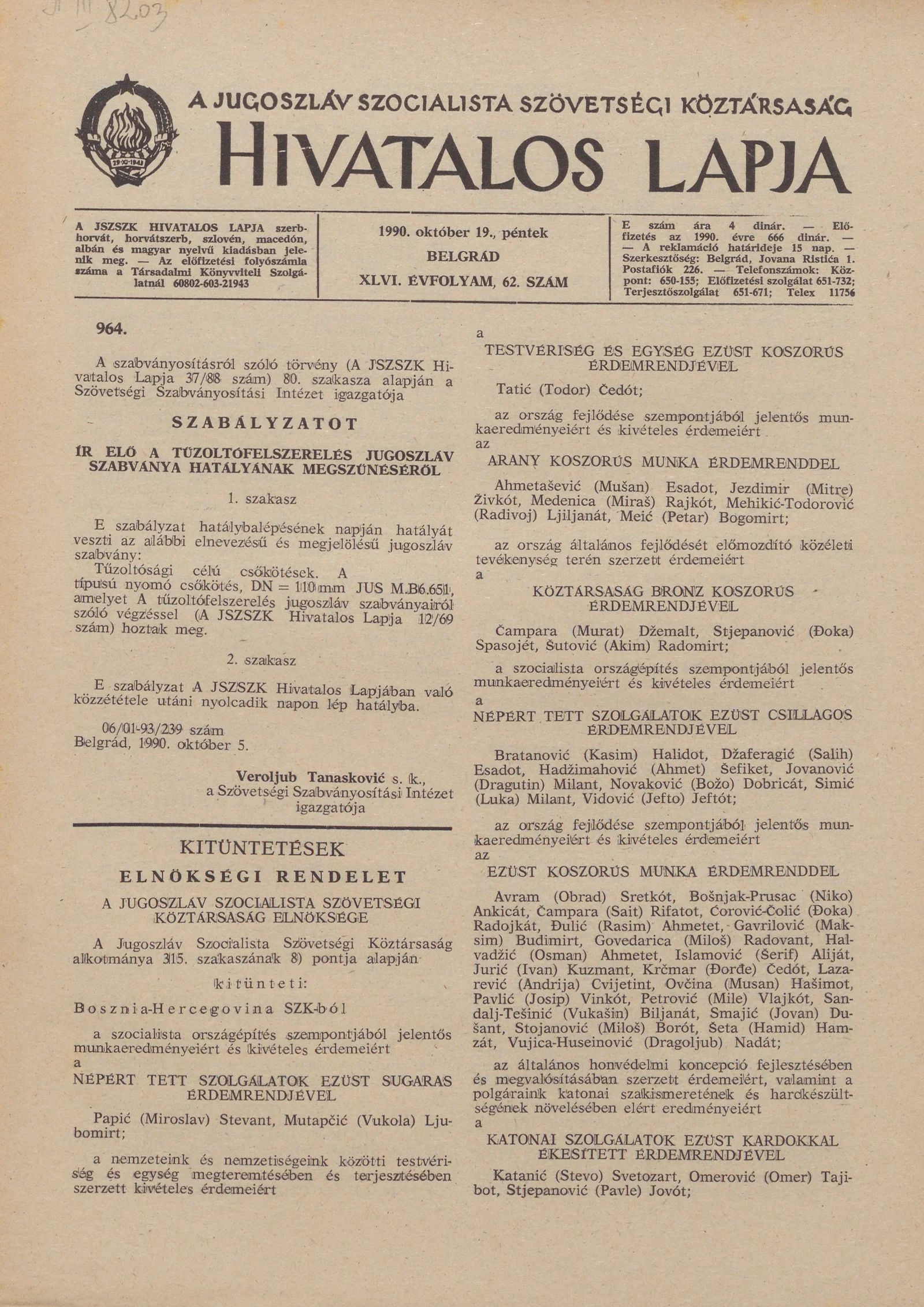 - A Jugoszláv Szocialista Szövetségi Köztársaság Hivatalos Lapja