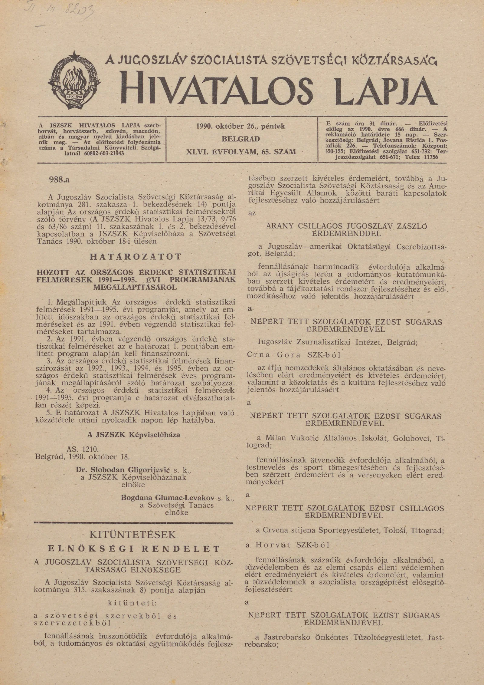 A Jugoszláv Szocialista Szövetségi Köztársaság Hivatalos Lapja, 46. évf. 1990. október 26. 65. sz. 1945–2056. oldal