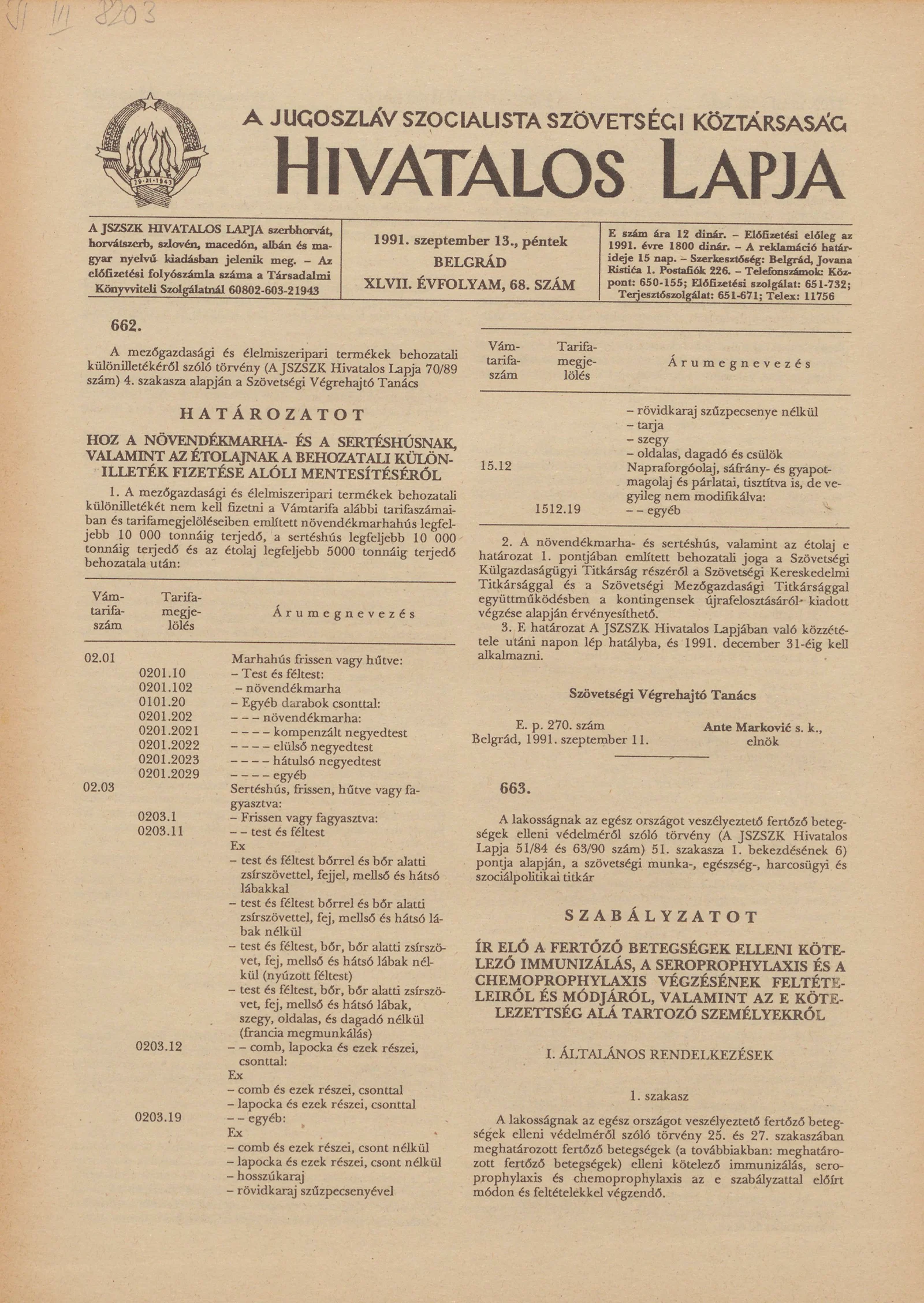 A Jugoszláv Szocialista Szövetségi Köztársaság Hivatalos Lapja, 47. évf. 1991. szeptember 13. 68. sz. 1101–1108. oldal