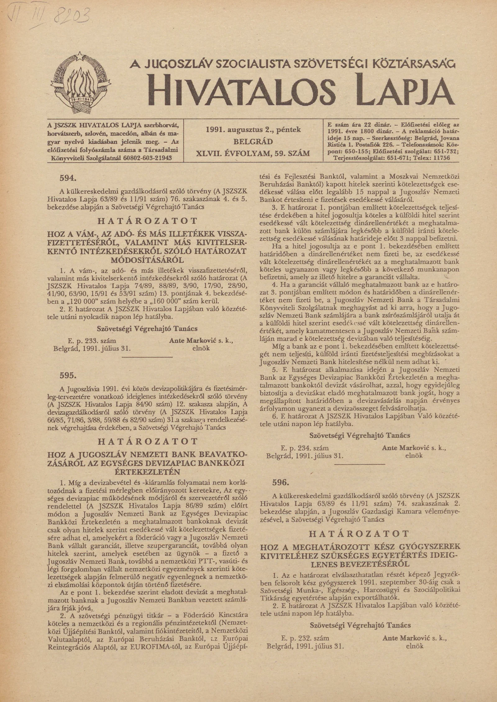 - Határozat a Jugoszláv Nemzeti Banknak az egységes devizapiac bankközi értekezletén való beavatkozásáról901
