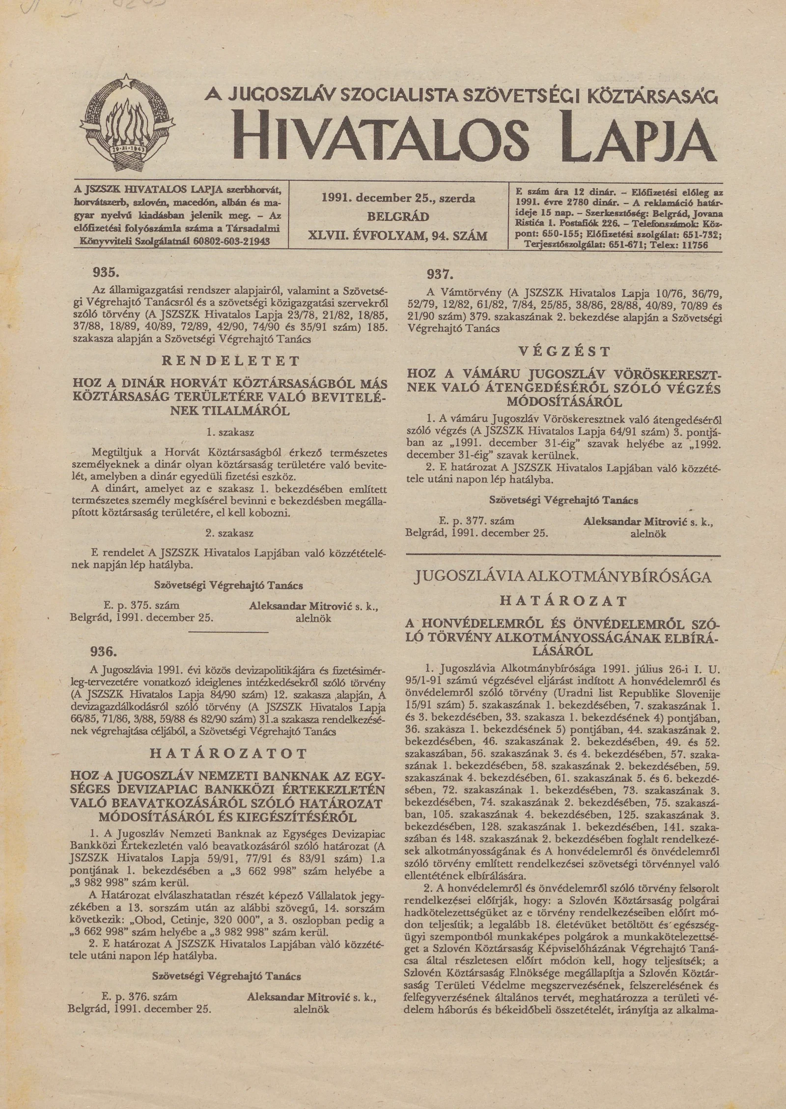 A Jugoszláv Szocialista Szövetségi Köztársaság Hivatalos Lapja, 47. évf. 1991. december 25. 94. sz. 1465–1468. oldal