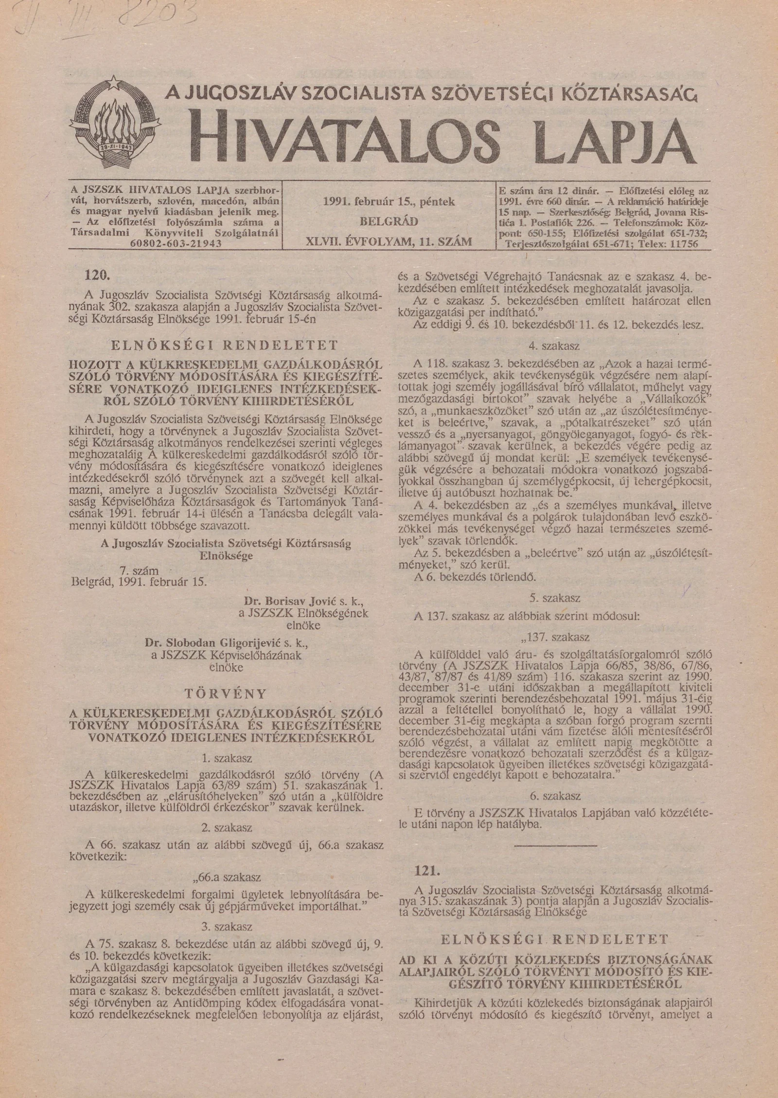 A Jugoszláv Szocialista Szövetségi Köztársaság Hivatalos Lapja, 47. évf. 1991. február 15. 11. sz. 181–204. oldal