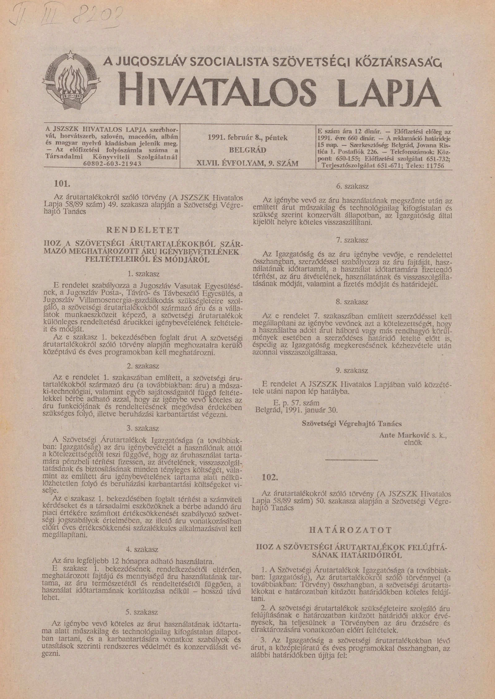 A Jugoszláv Szocialista Szövetségi Köztársaság Hivatalos Lapja, 47. évf. 1991. február 8. 9. sz. 149–176. oldal