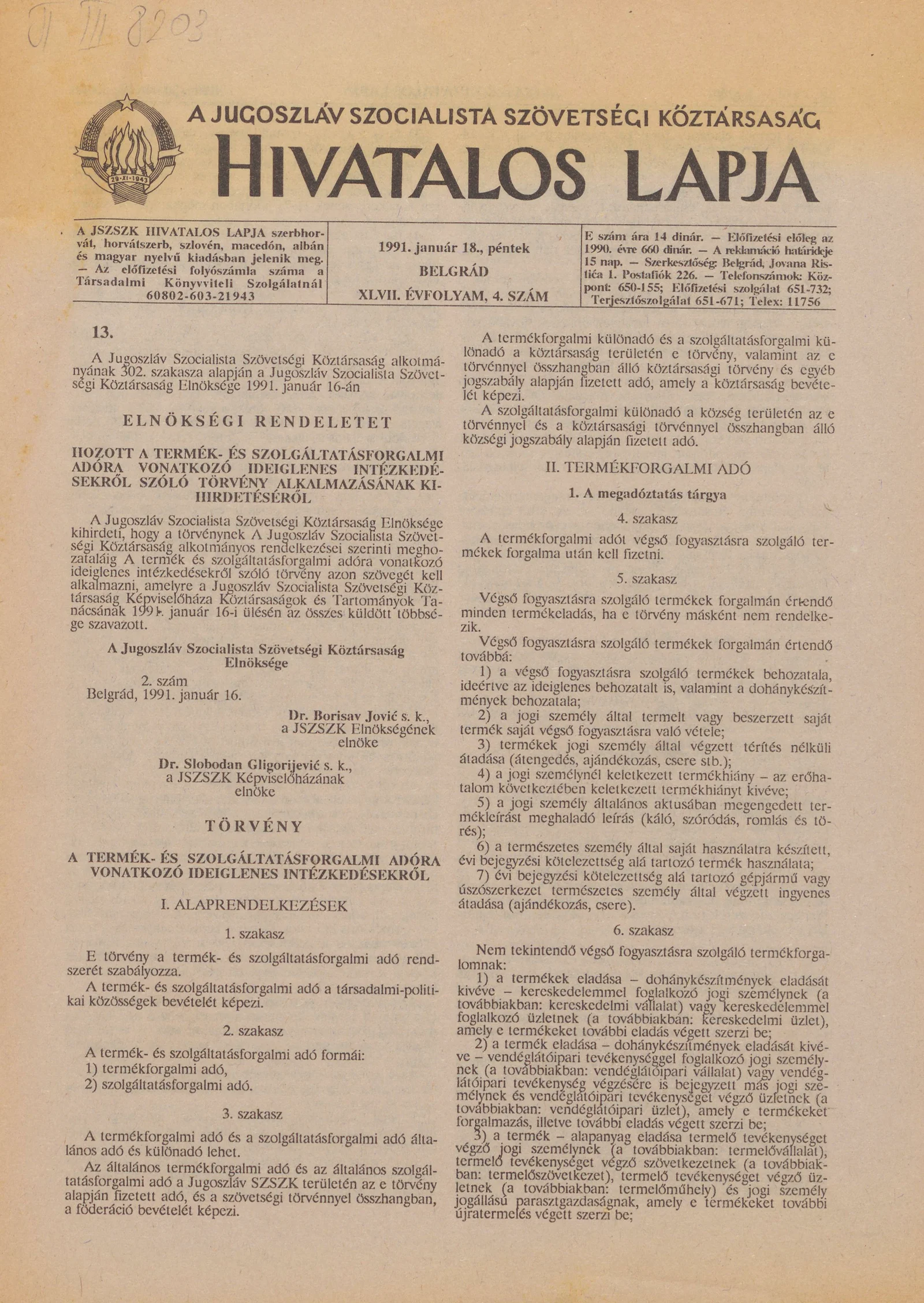 A Jugoszláv Szocialista Szövetségi Köztársaság Hivatalos Lapja, 47. évf. 1991. január 18. 4. sz. 25–68. oldal