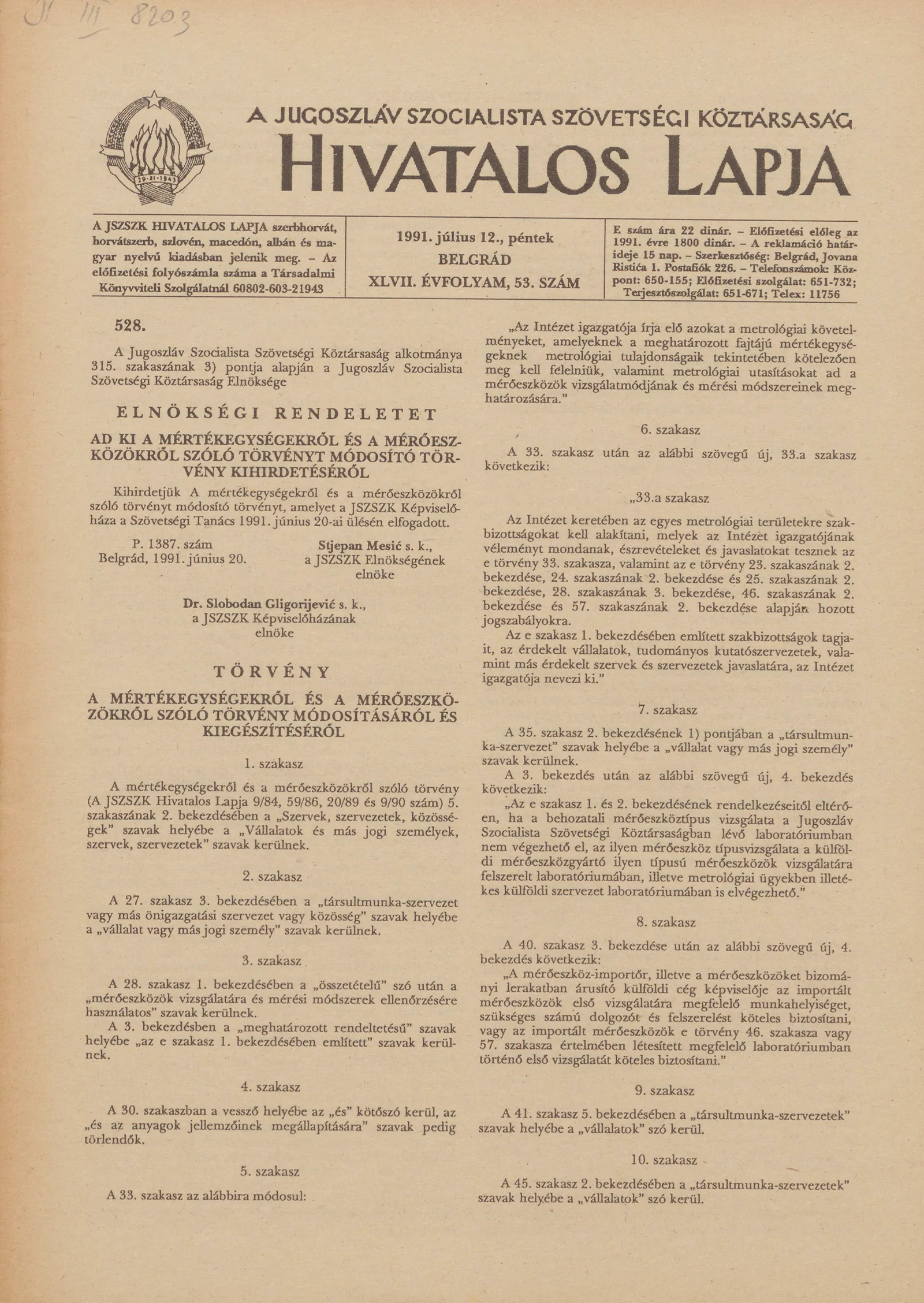 A Jugoszláv Szocialista Szövetségi Köztársaság Hivatalos Lapja, 47. évf. 1991. július 12. 53. sz. 793–820. oldal