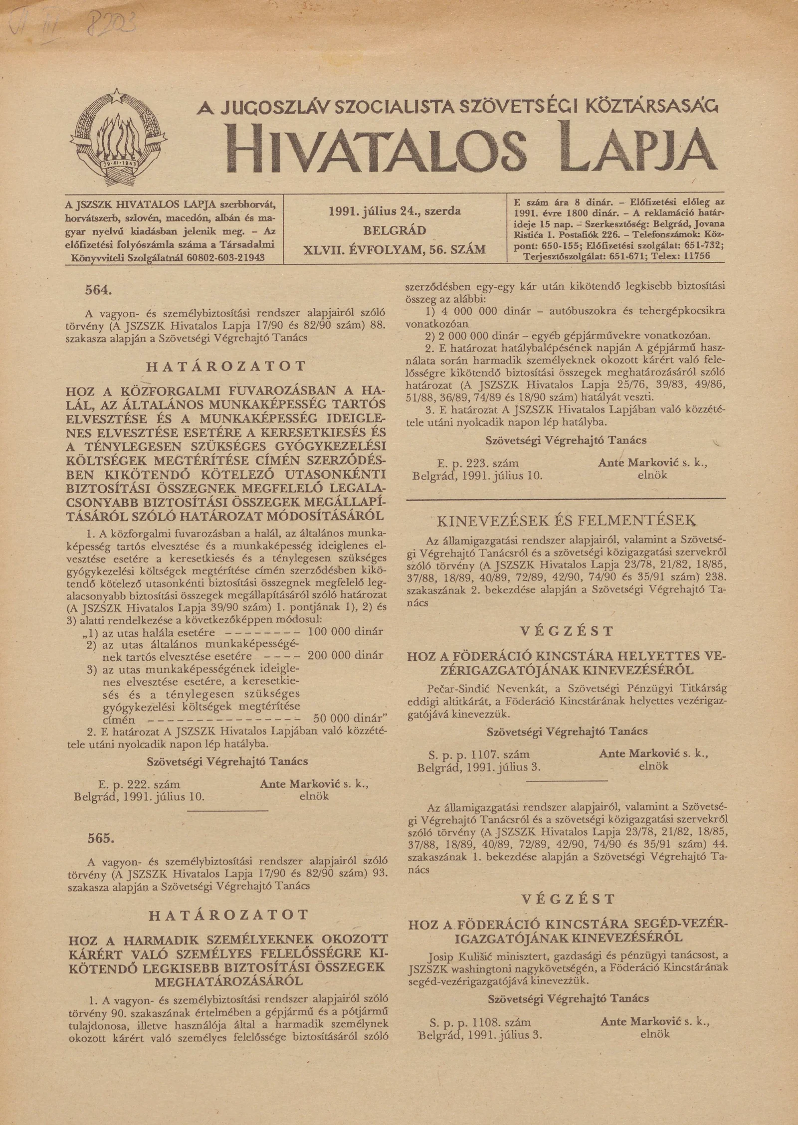 A Jugoszláv Szocialista Szövetségi Köztársaság Hivatalos Lapja, 47. évf. 1991. július 24. 56. sz. 869–872. oldal