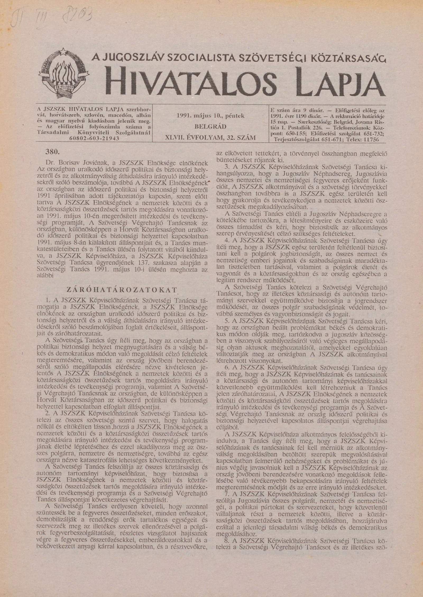 A Jugoszláv Szocialista Szövetségi Köztársaság Hivatalos Lapja, 47. évf. 1991. május 10. 32. sz. 573–580. oldal