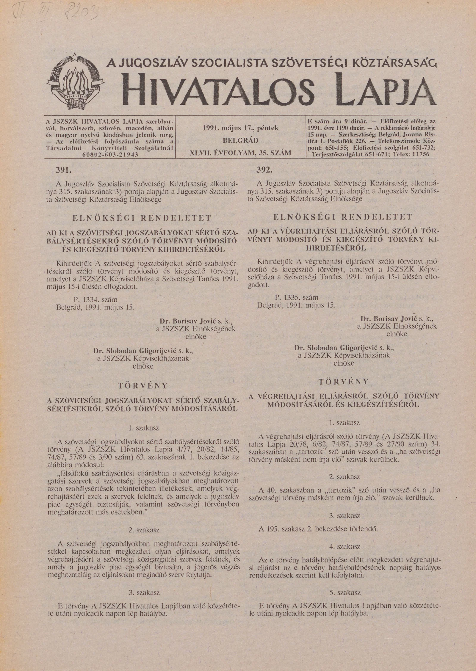 A Jugoszláv Szocialista Szövetségi Köztársaság Hivatalos Lapja, 47. évf. 1991. május 17. 35. sz. 589–596. oldal