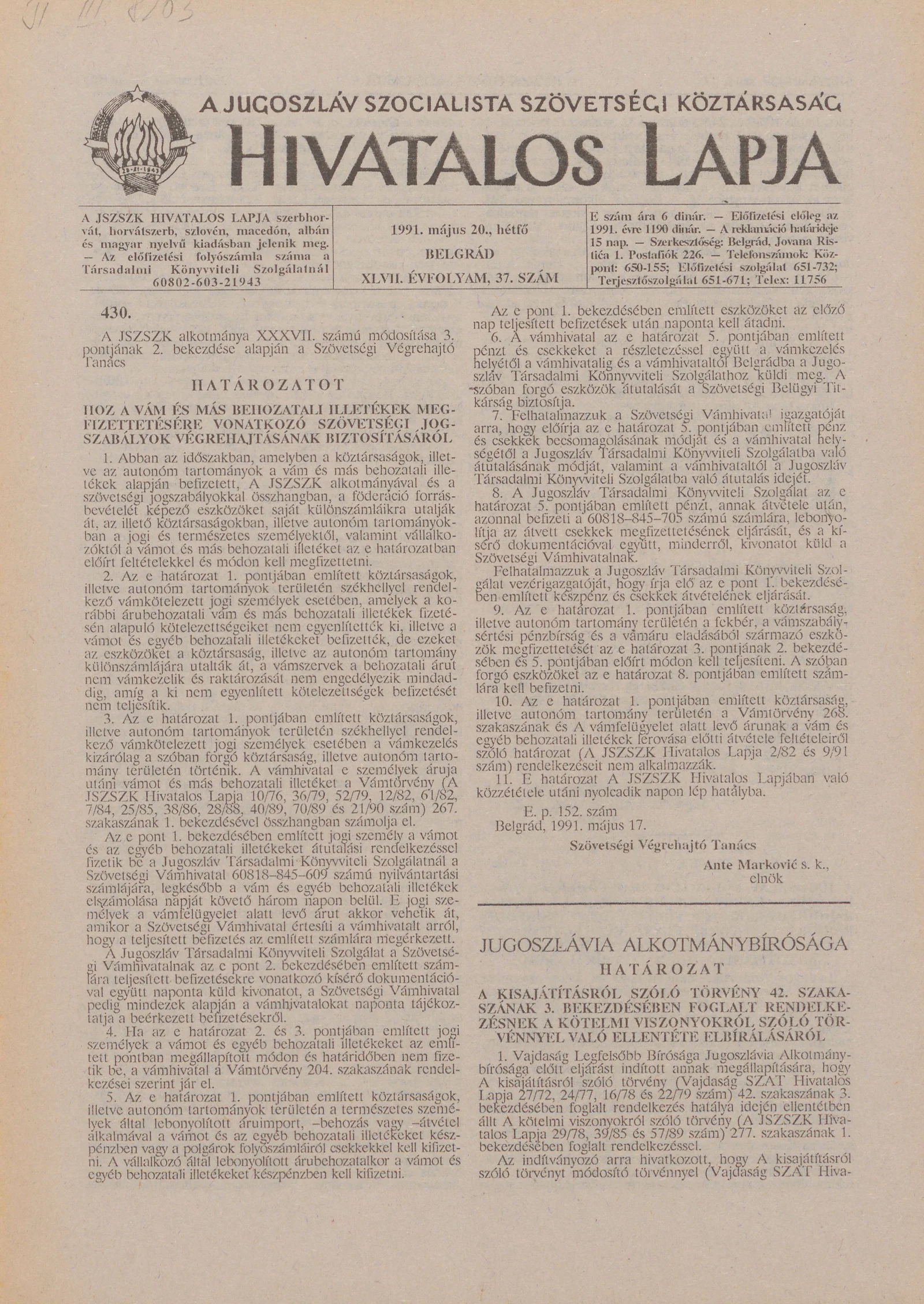 A Jugoszláv Szocialista Szövetségi Köztársaság Hivatalos Lapja, 47. évf. 1991. május 20. 37. sz. 617–620. oldal