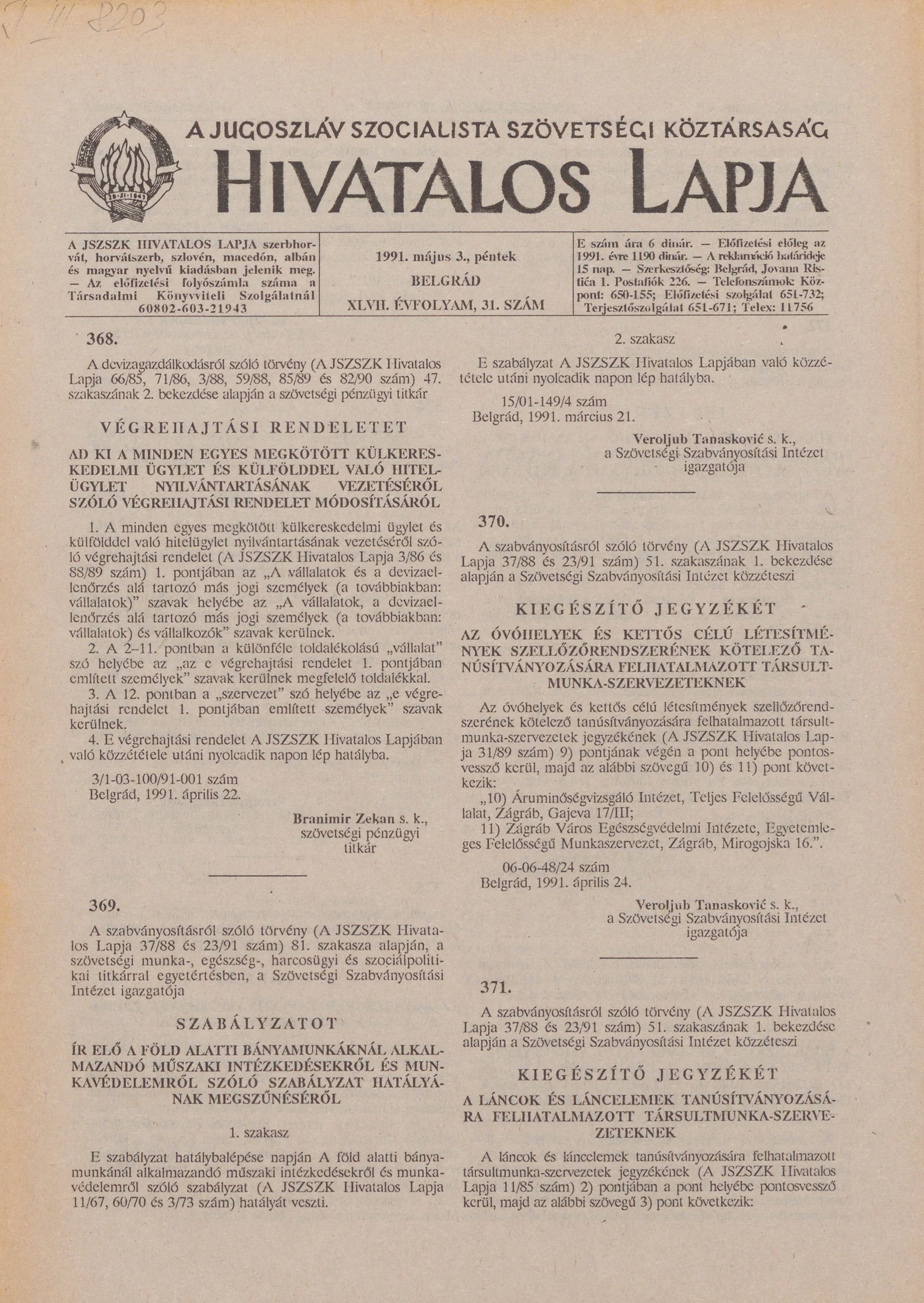 A Jugoszláv Szocialista Szövetségi Köztársaság Hivatalos Lapja, 47. évf. 1991. május 3. 31. sz. 569–572. oldal