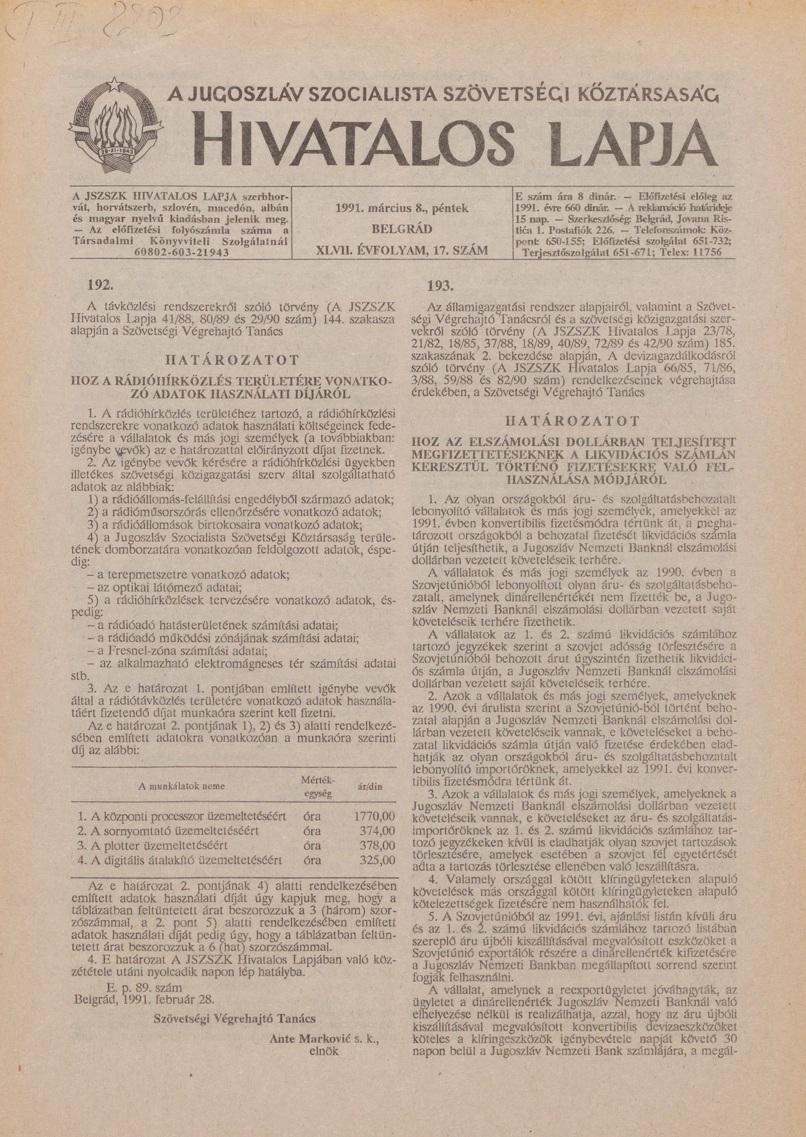 A Jugoszláv Szocialista Szövetségi Köztársaság Hivatalos Lapja, 47. évf. 1991. március 8. 17. sz. 265–276. oldal