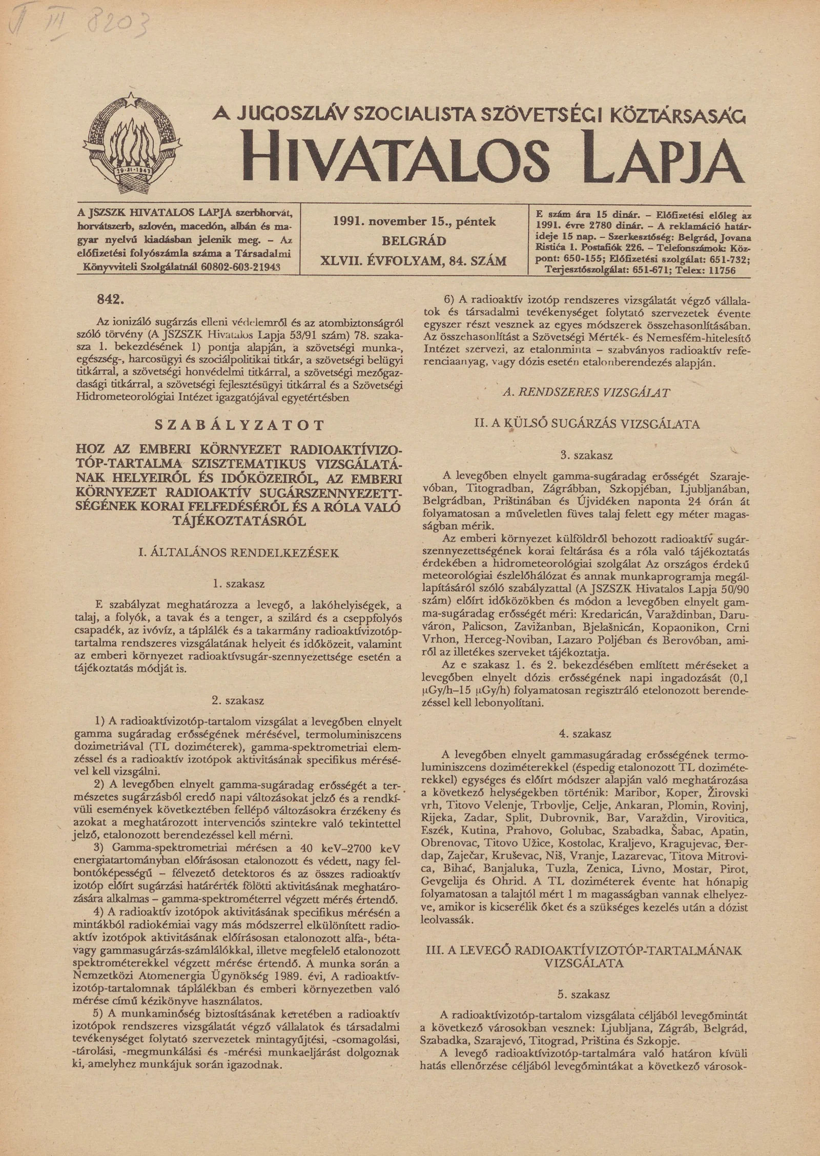 A Jugoszláv Szocialista Szövetségi Köztársaság Hivatalos Lapja, 47. évf. 1991. november 15. 84. sz. 1337–1344. oldal