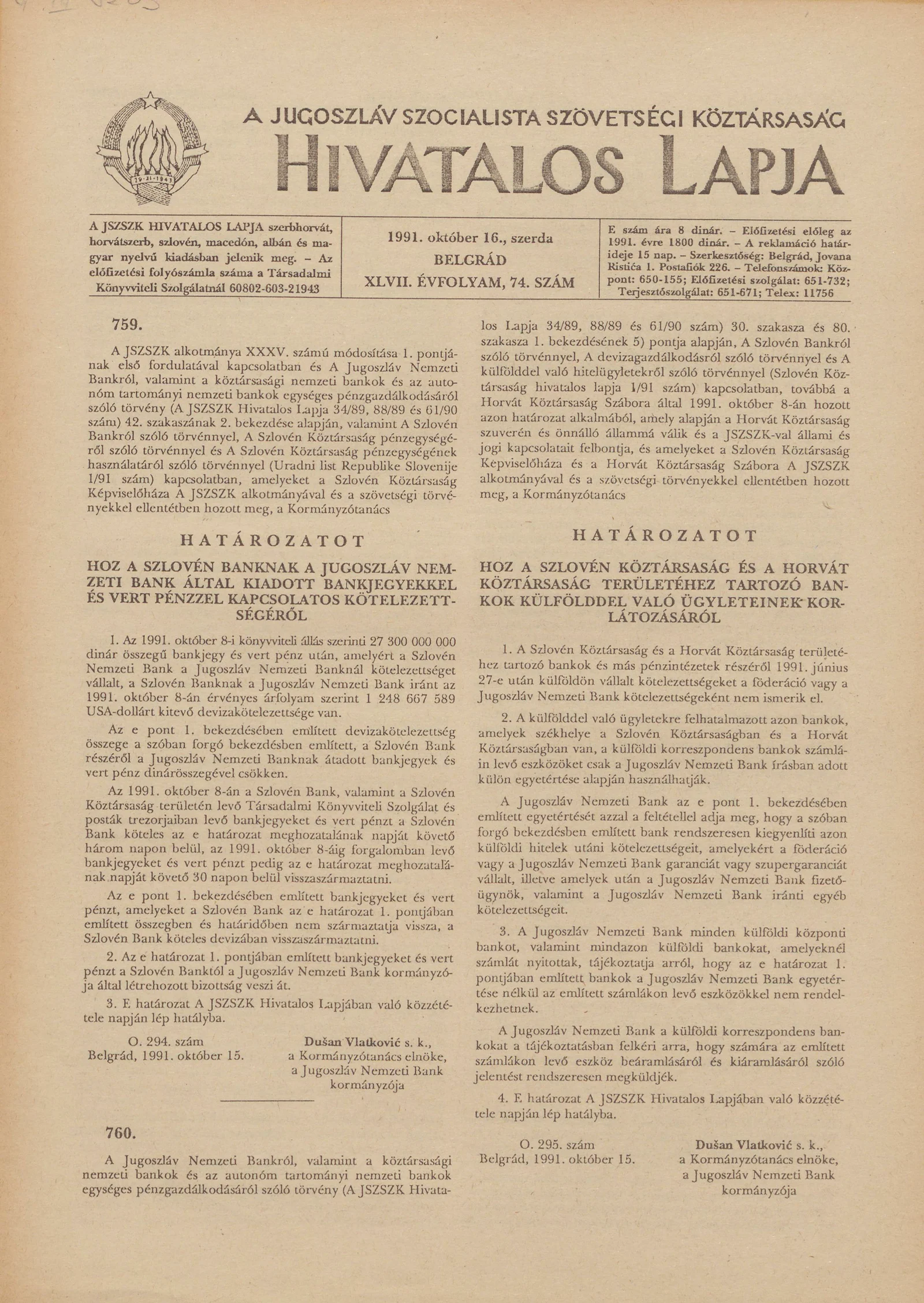 A Jugoszláv Szocialista Szövetségi Köztársaság Hivatalos Lapja, 47. évf. 1991. október 16. 74. sz. 1205–1208. oldal