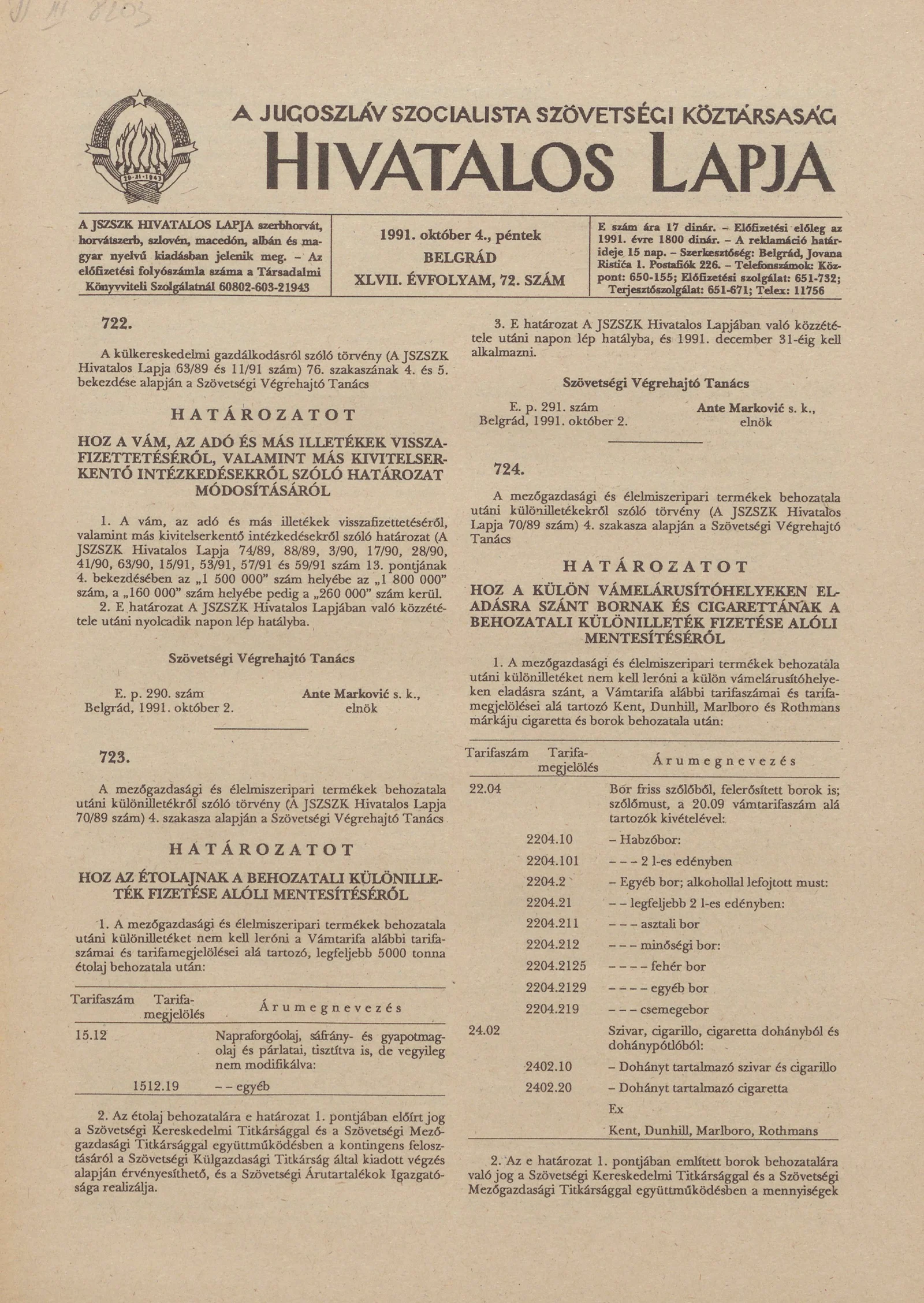 A Jugoszláv Szocialista Szövetségi Köztársaság Hivatalos Lapja, 47. évf. 1991. október 4. 72. sz. 1173–1196. oldal