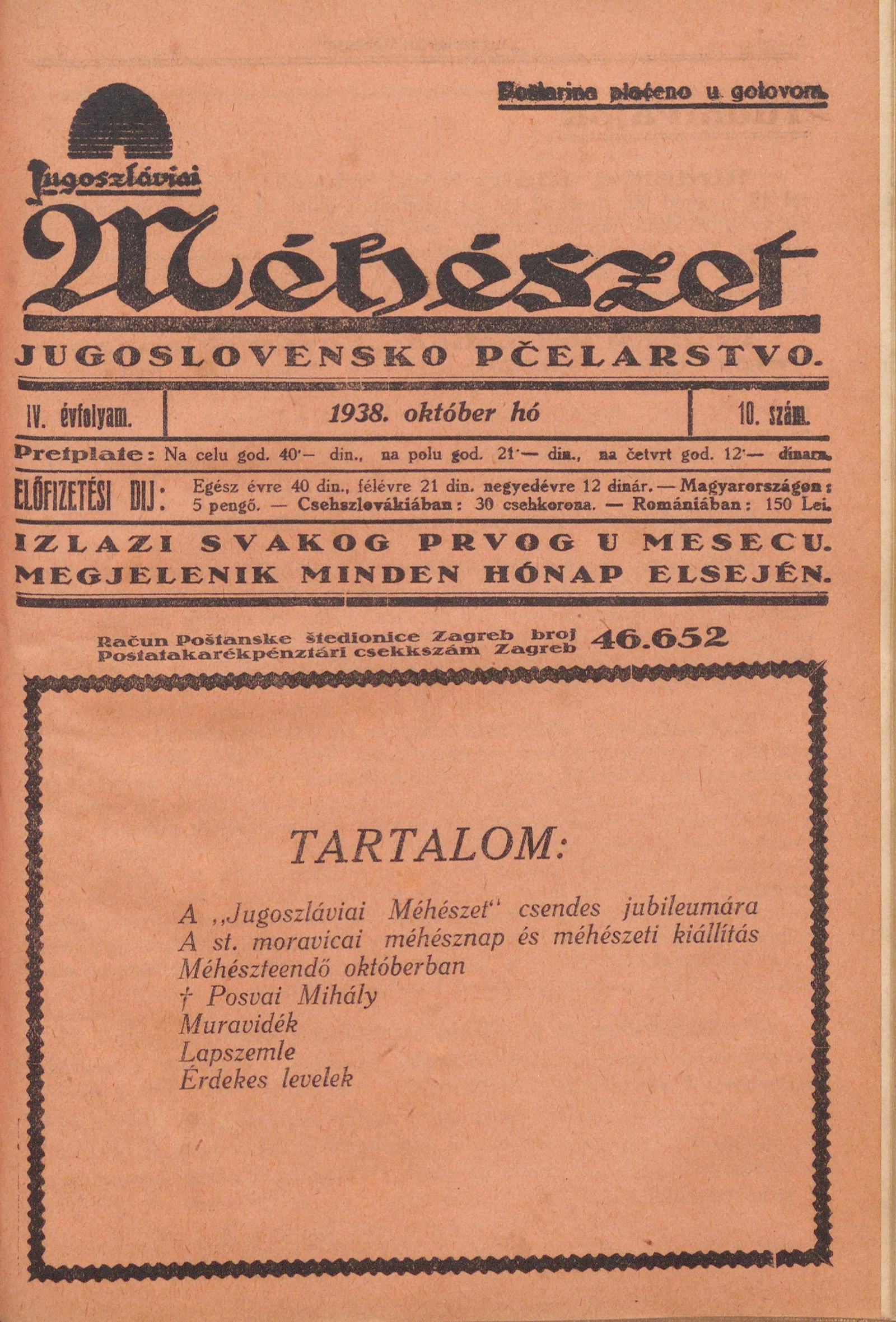 Jugoszláviai méhészet, 4. évf. 1938. október 1. 10. sz.