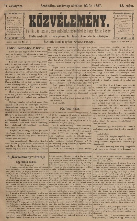 Közvélemény, 2. évf. 1887. október 23. 43. sz.