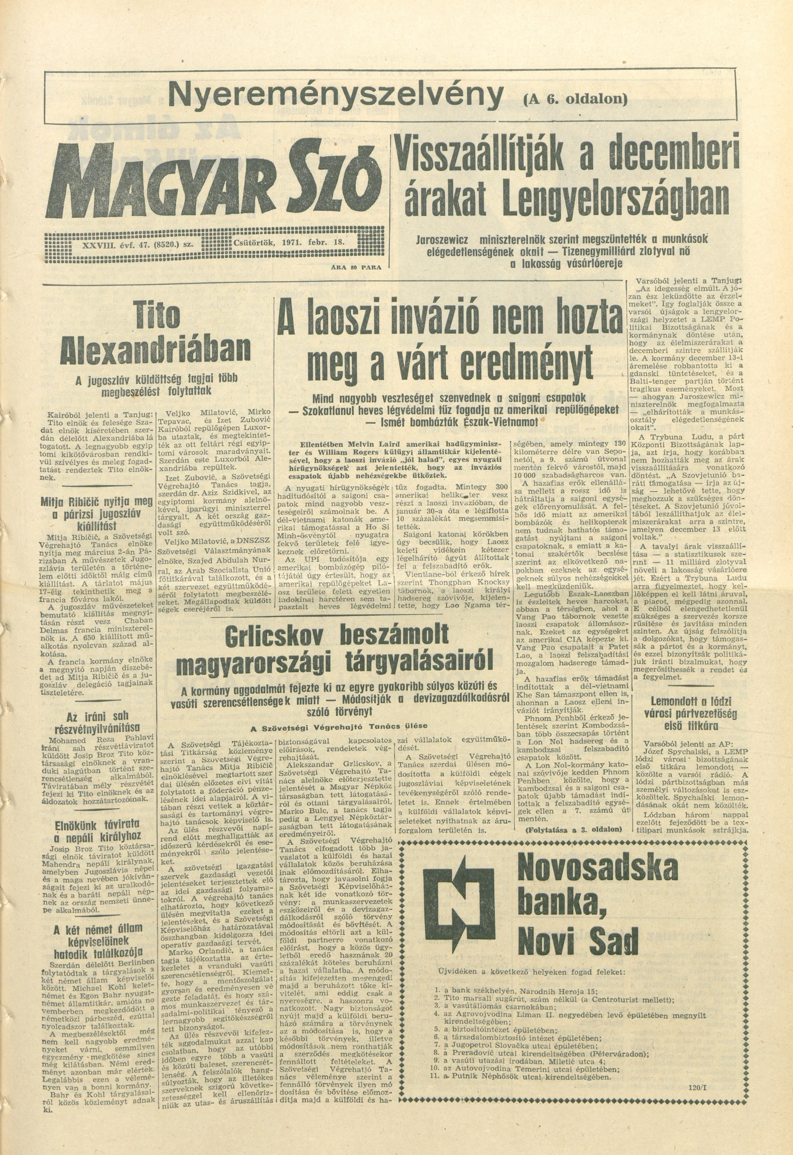 Magyar Szó, 28. évf. 1971. február 18. 47. sz. 1–16. oldal