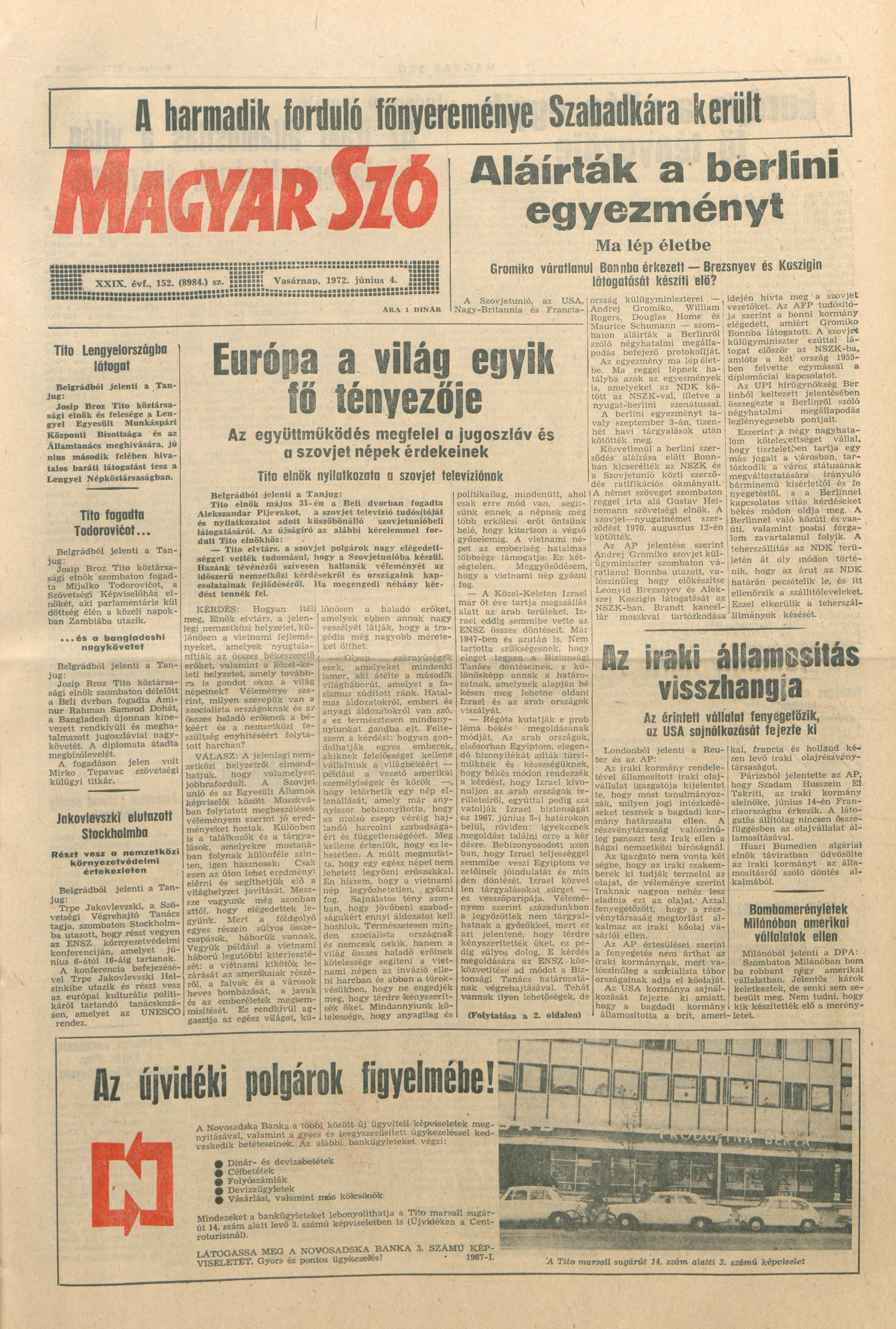 Magyar Szó, 29. évf. 1972. június 4. 152. sz. 1–28. oldal