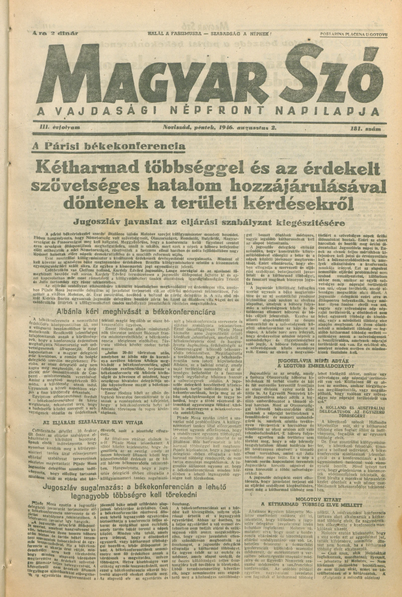 Magyar Szó, 3. évf. 1946. augusztus 2. 181. sz. 1–8. oldal