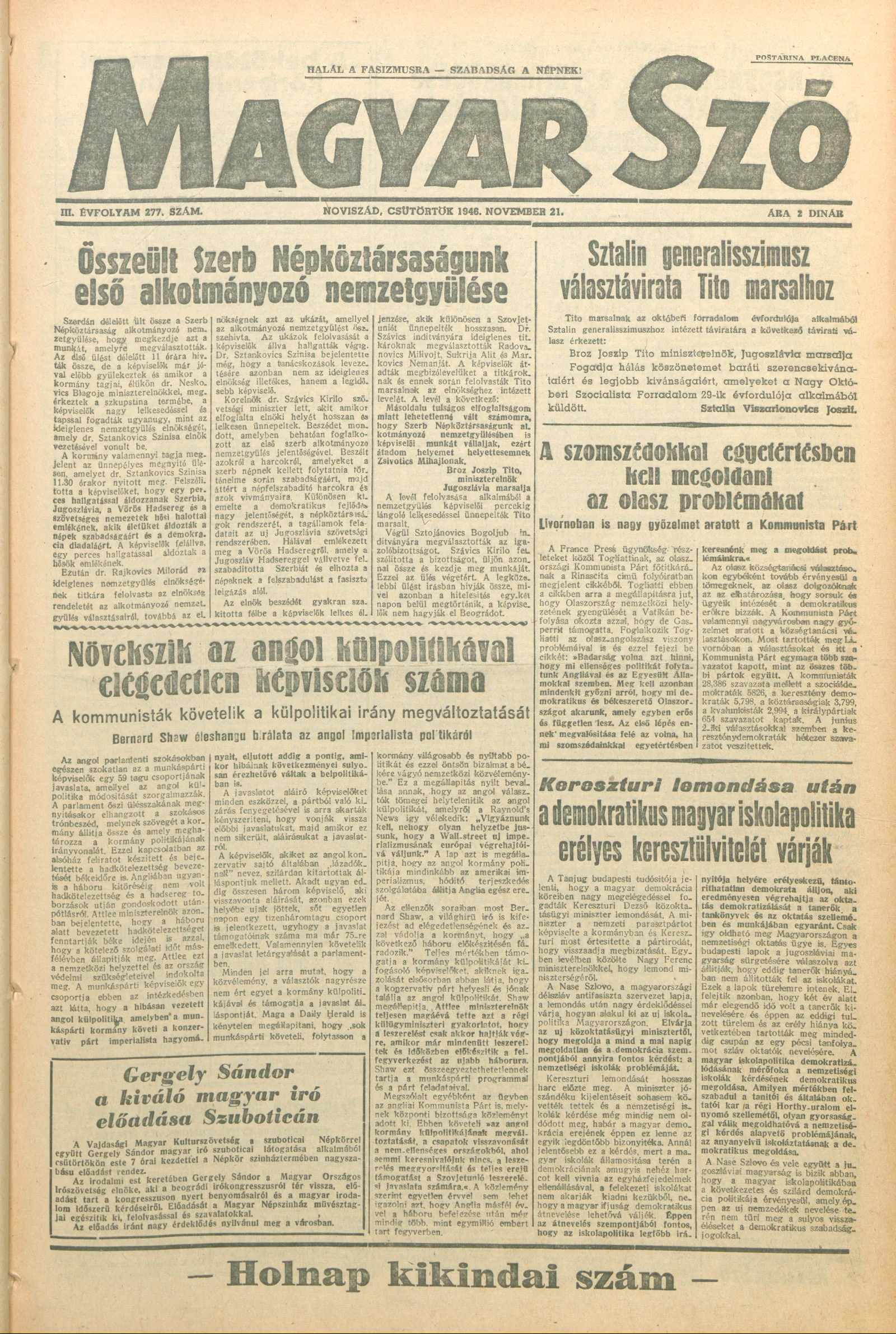 Magyar Szó, 3. évf. 1946. november 21. 277. sz. 1–6. oldal