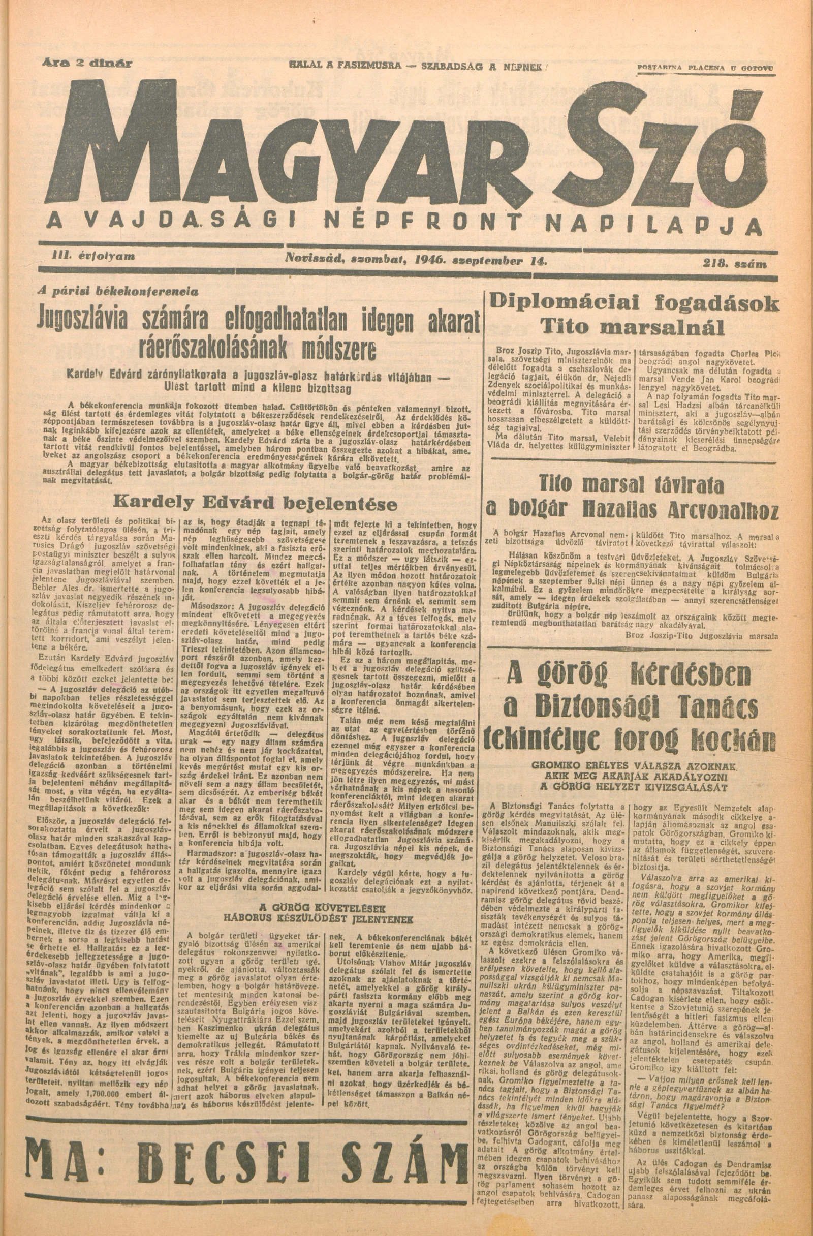 Magyar Szó, 3. évf. 1946. szeptember 14. 218. sz. 1–6. oldal