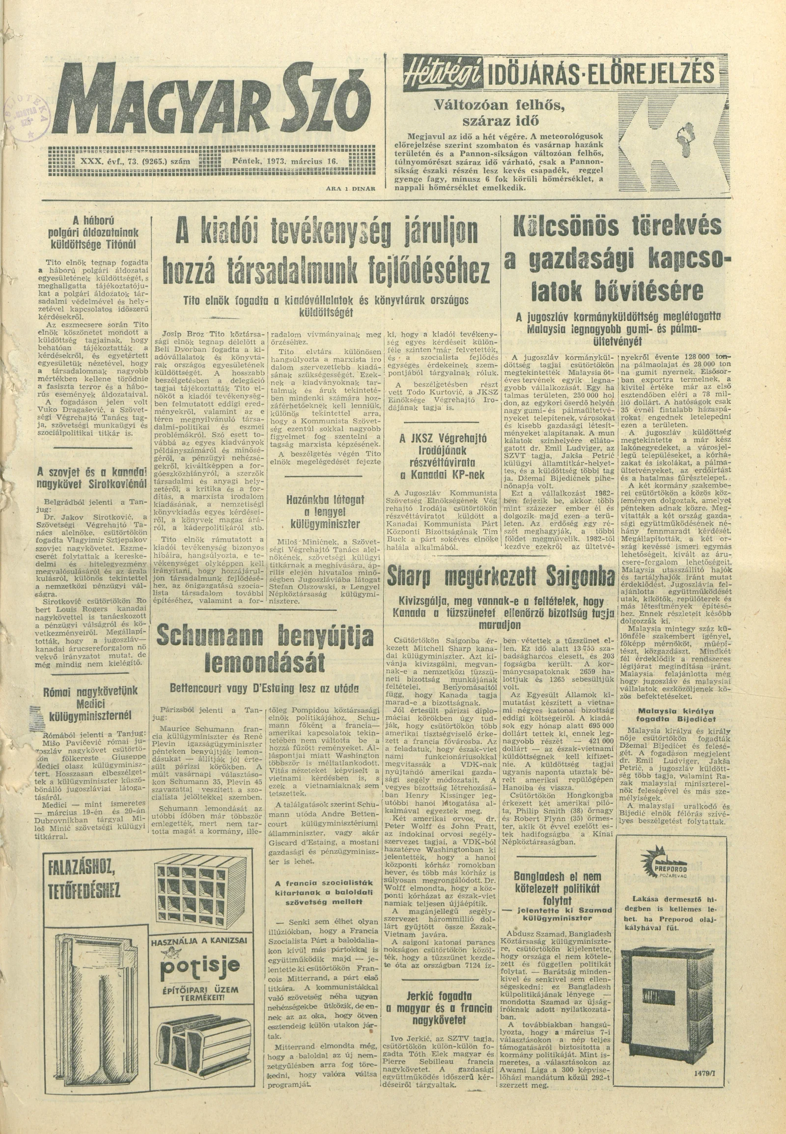 Magyar Szó, 30. évf. 1973. március 16. 73. sz. 1–14. oldal
