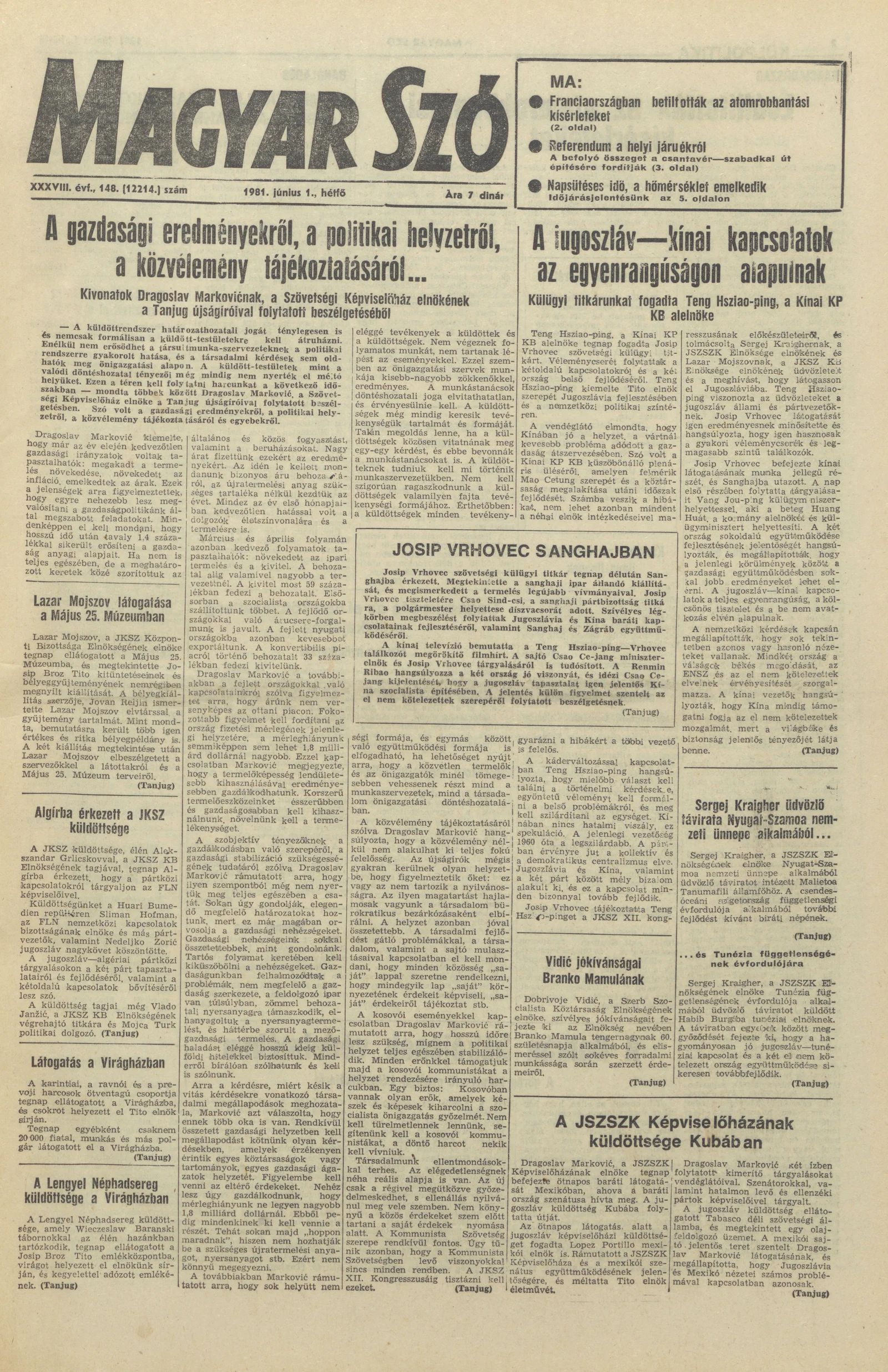 Magyar Szó, 38. évf. 1981. június 1. 148. sz.