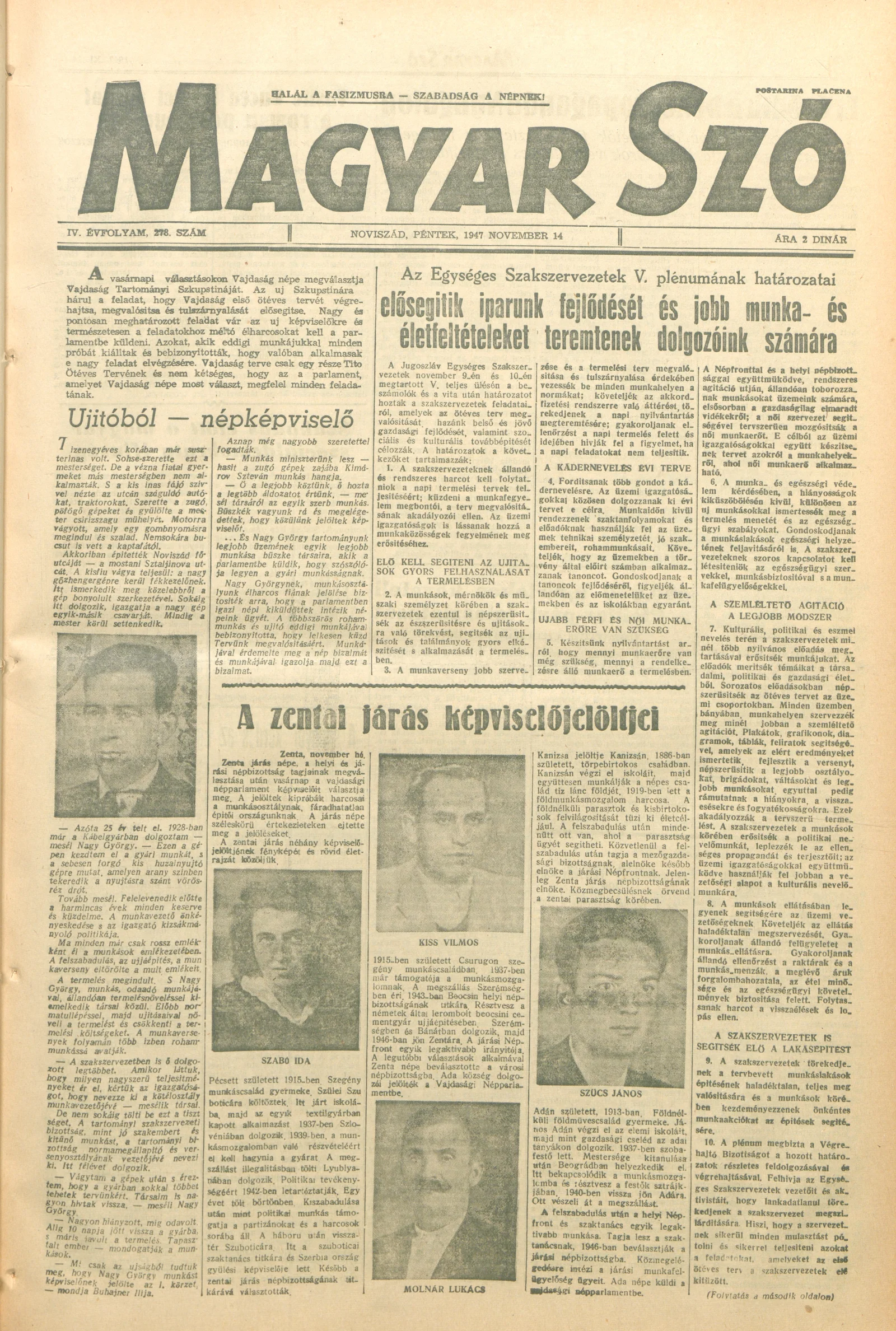 Magyar Szó, 4. évf. 1947. november 14. 278. sz. 1–6. oldal