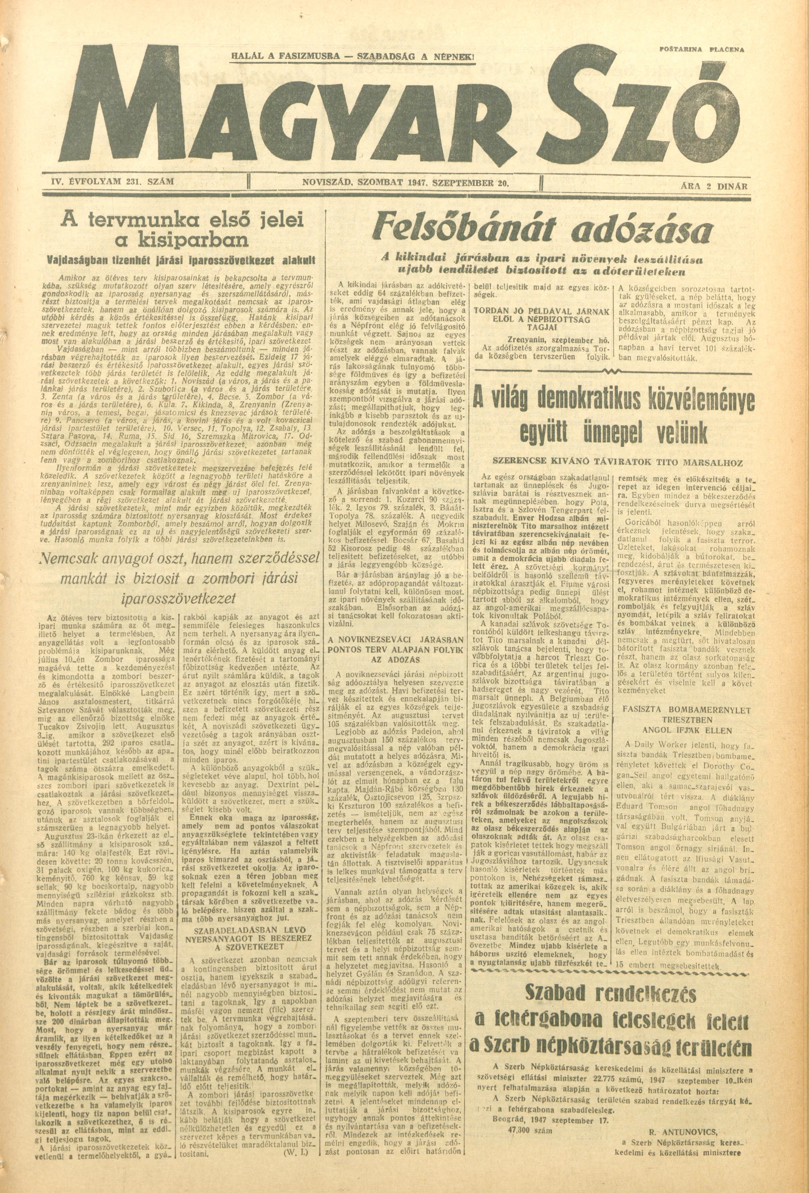Magyar Szó, 4. évf. 1947. szeptember 20. 231. sz. 1–6. oldal