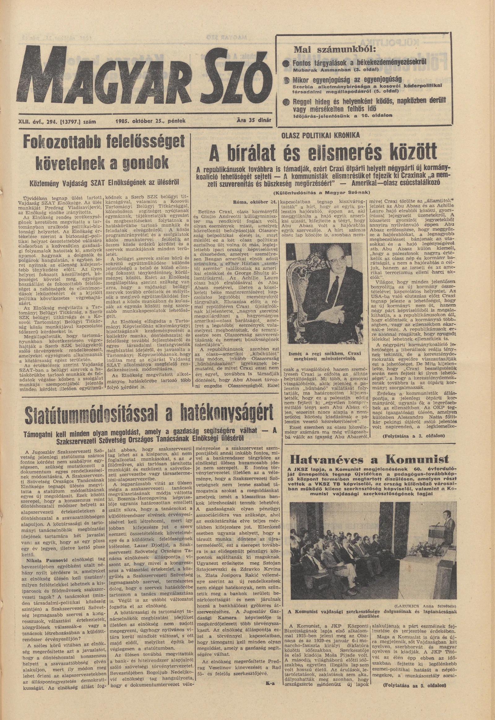 Magyar Szó, 42. évf. 1985. október 25. 294. sz. 1–20. oldal