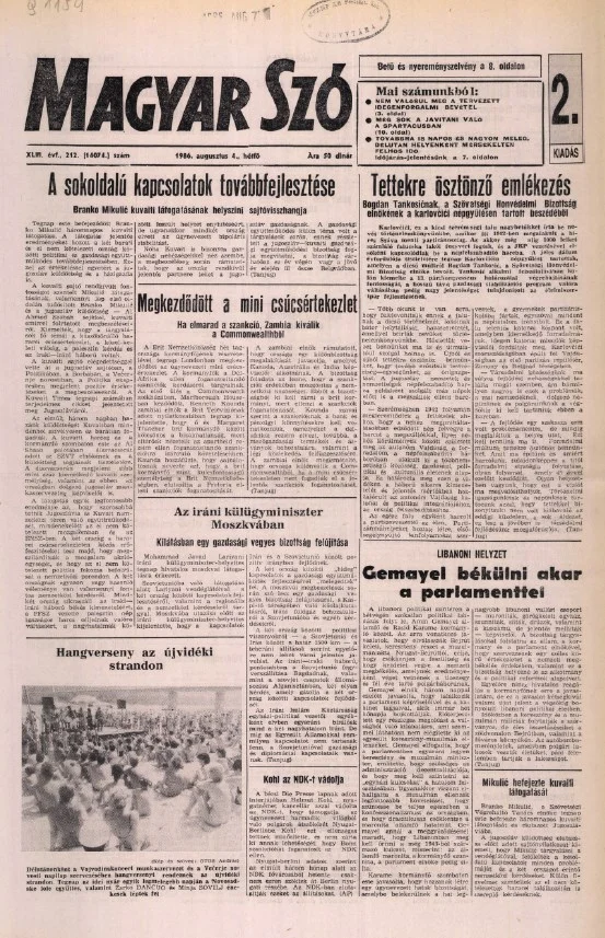 Magyar Szó, 43. évf. 1986. augusztus 4. 212. sz. 1–16. oldal