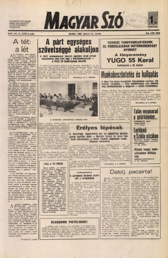 Magyar Szó, 46. évf. 1989. március 15. 71. sz. 1–20. oldal