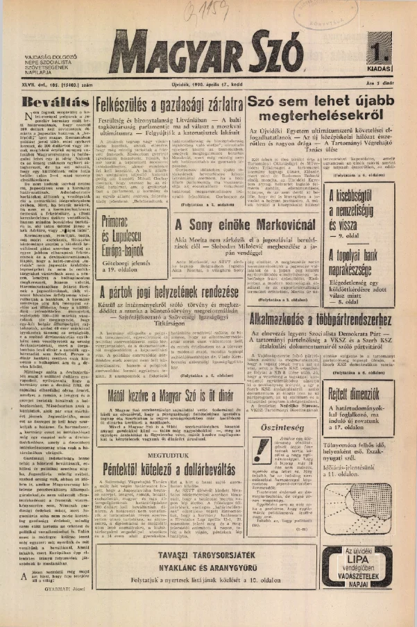 Magyar Szó, 47. évf. 1990. április 17. 105. sz. 1–20. oldal