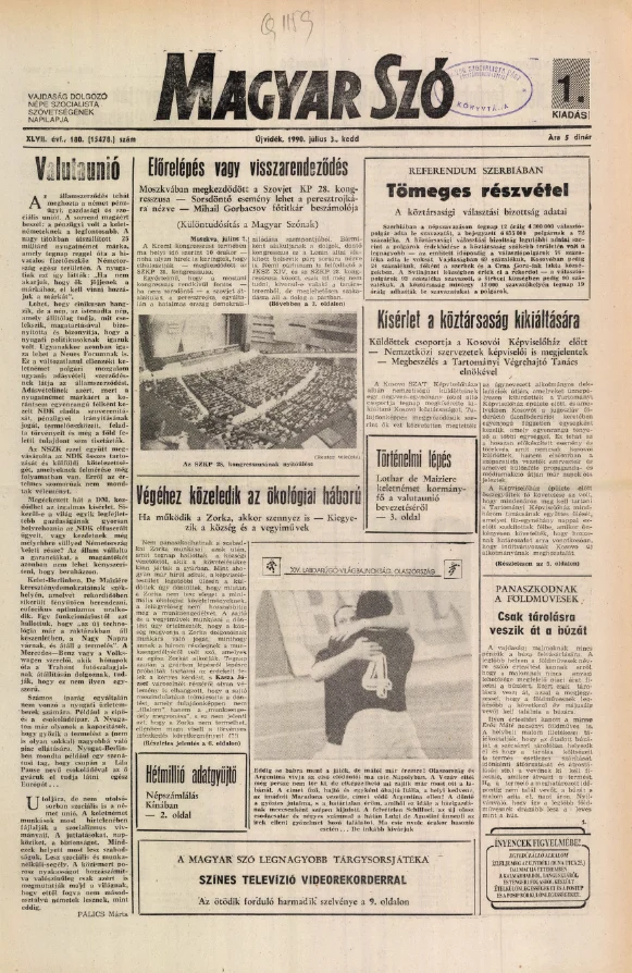 Magyar Szó, 47. évf. 1990. július 3. 180. sz. 1–20. oldal